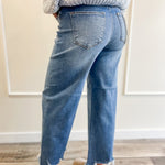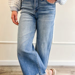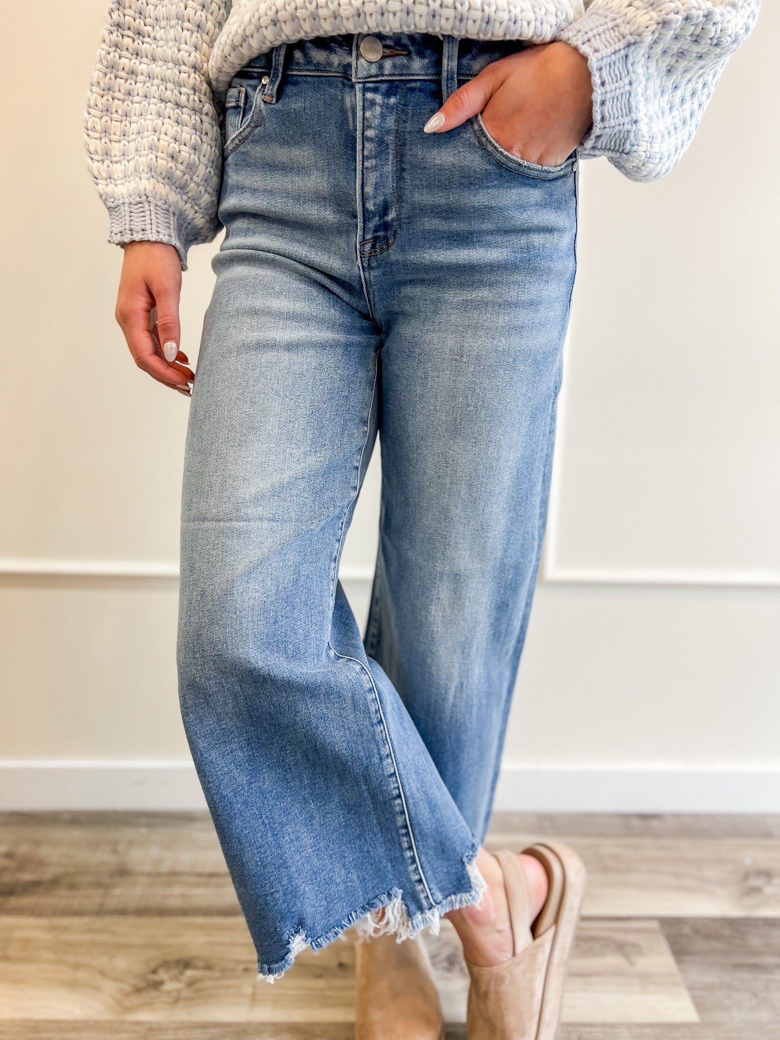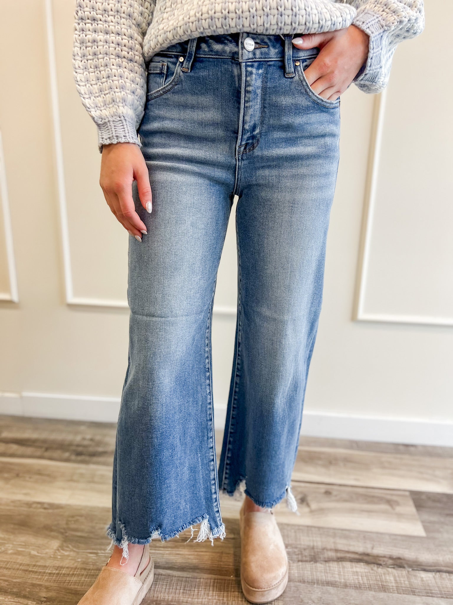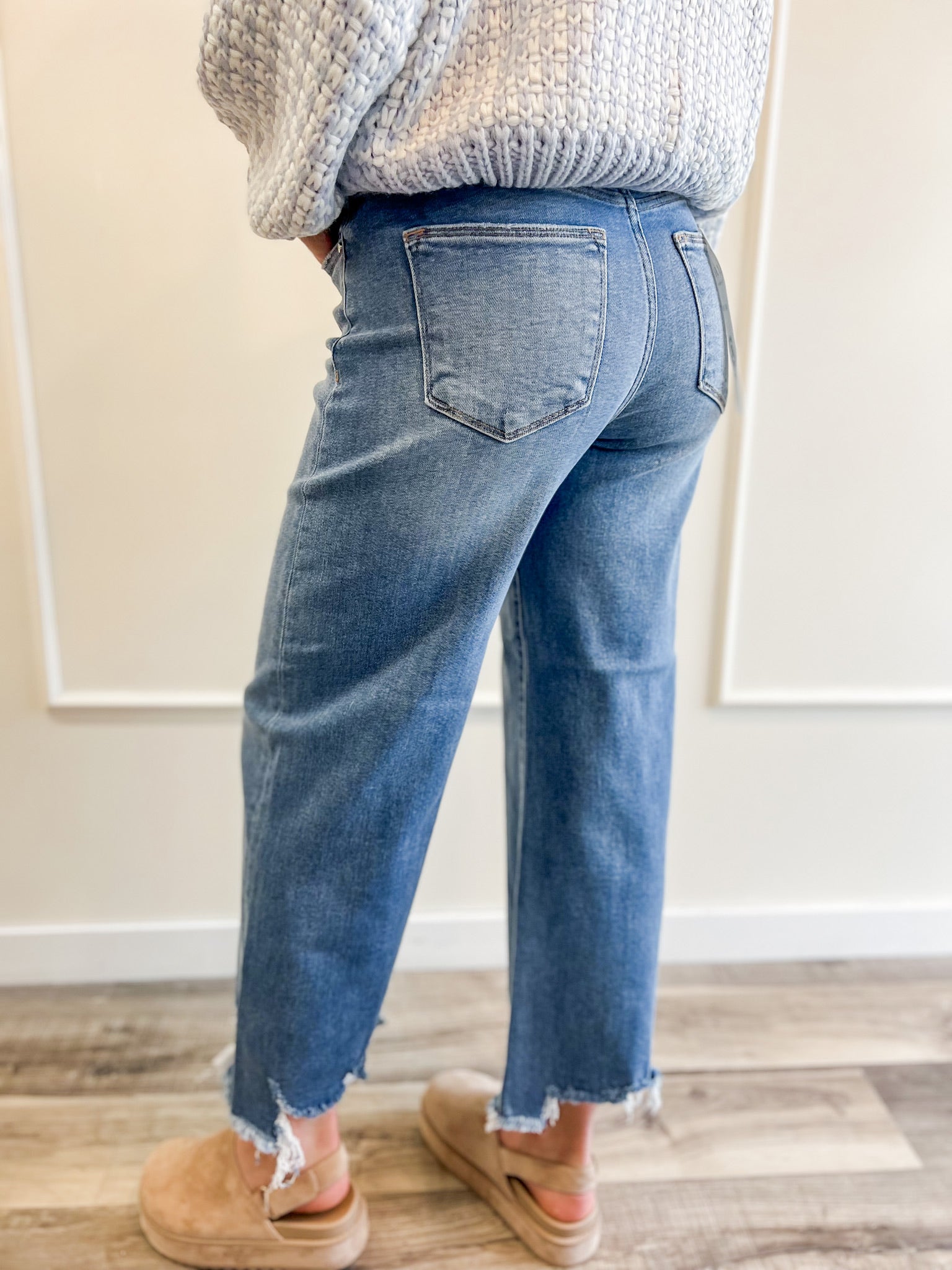 A light-wash crop flare with the cutest raw hem — easy, lived-in, and instantly outfit-ready. These jeans bring that effortless, flattering shape busy moms love.