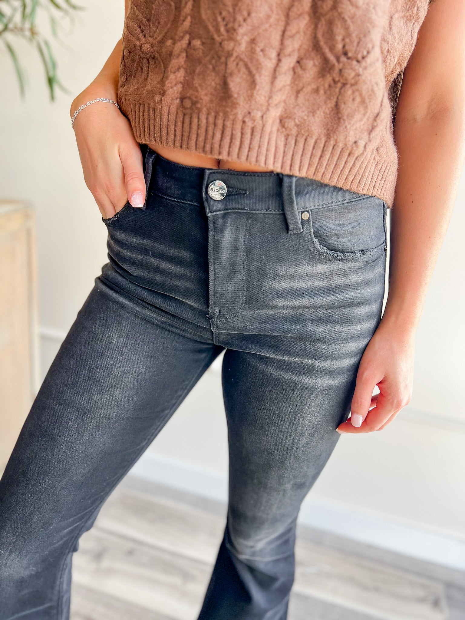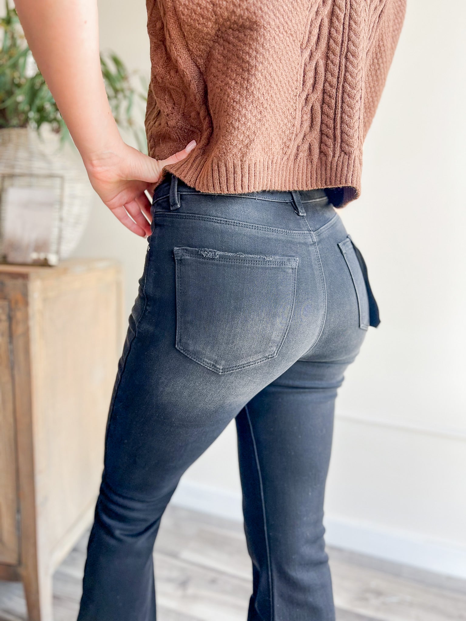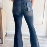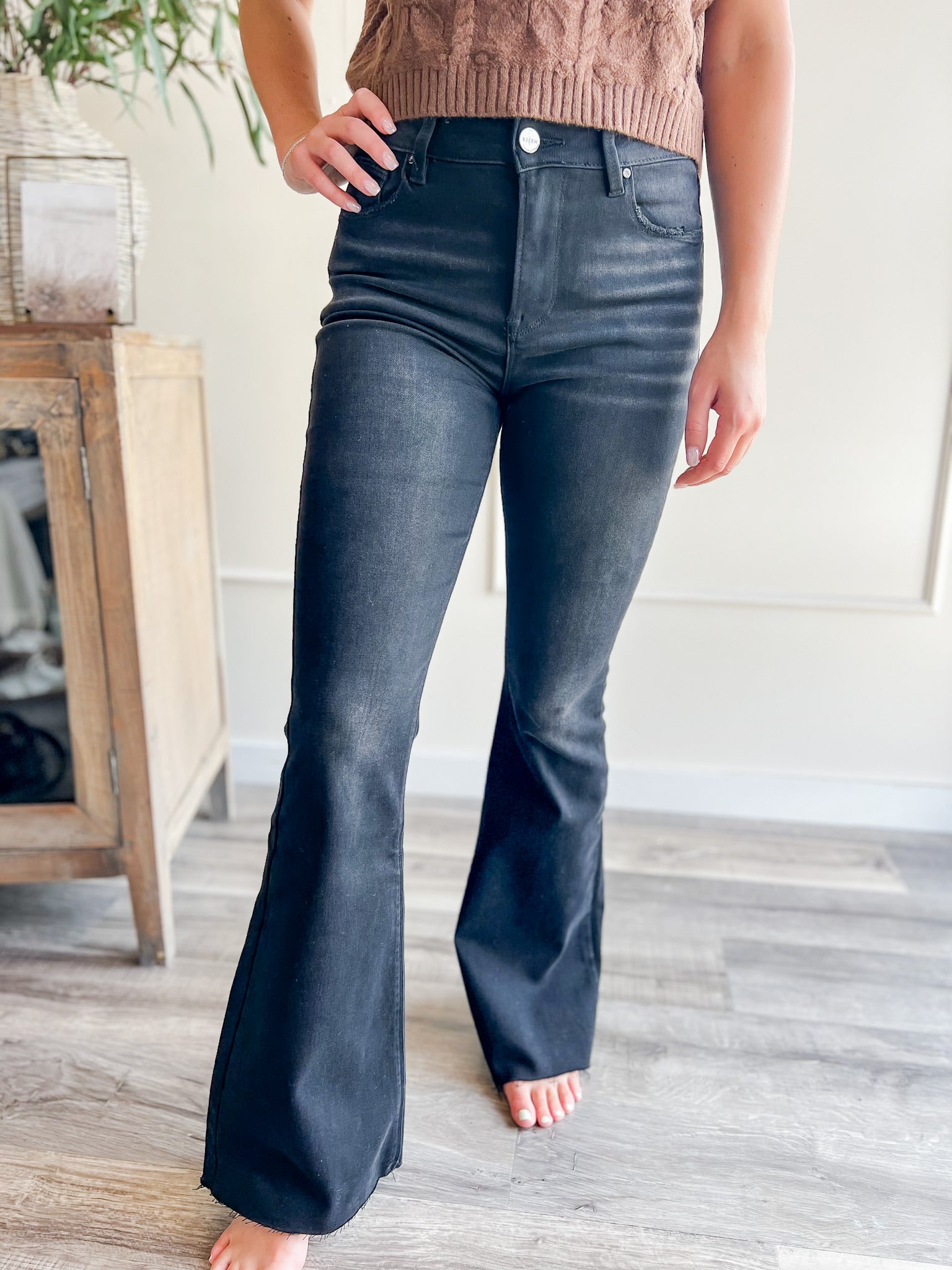 Step into instant confidence with the Night Out Flare Jeans. These high-rise, jet-black flares hug in all the right places before breaking out into a bold leg that elongates your silhouette. With a sleek faded wash and raw hem, they strike the perfect balance between classic and edgy.