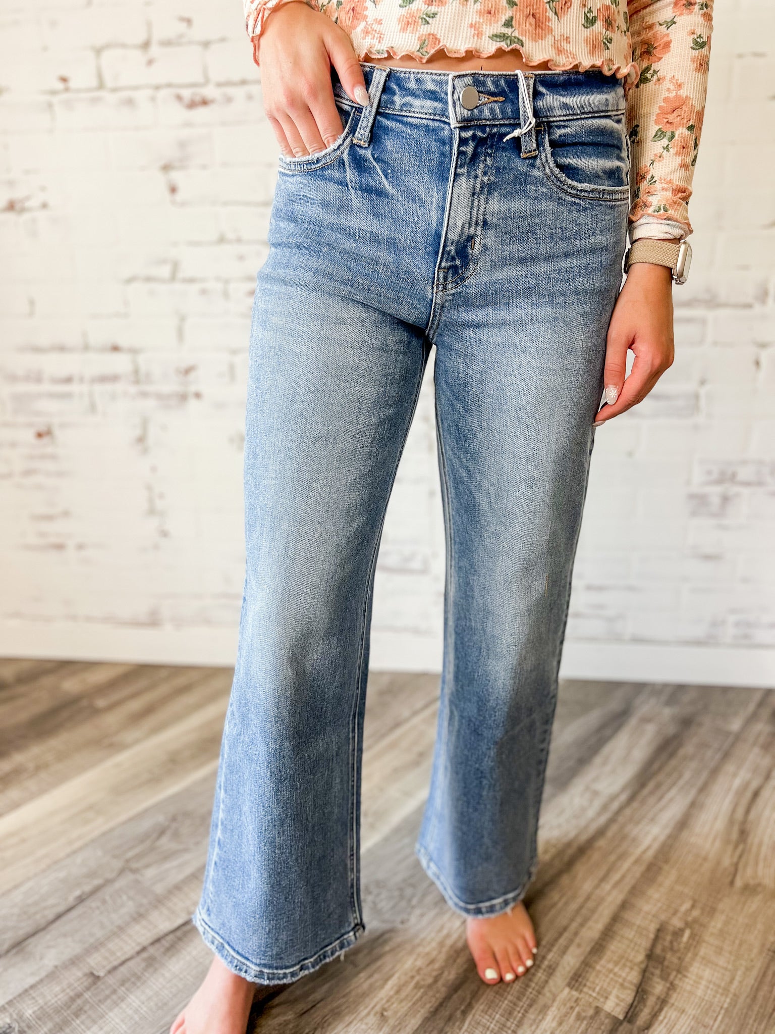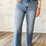 Easy, breezy, and made to flatter. These high-rise wide leg jeans feature a classic medium wash with subtle fading that gives them that perfectly lived-in vibe. The relaxed fit makes them versatile for pairing with sneakers, sandals, or booties.