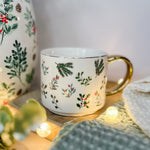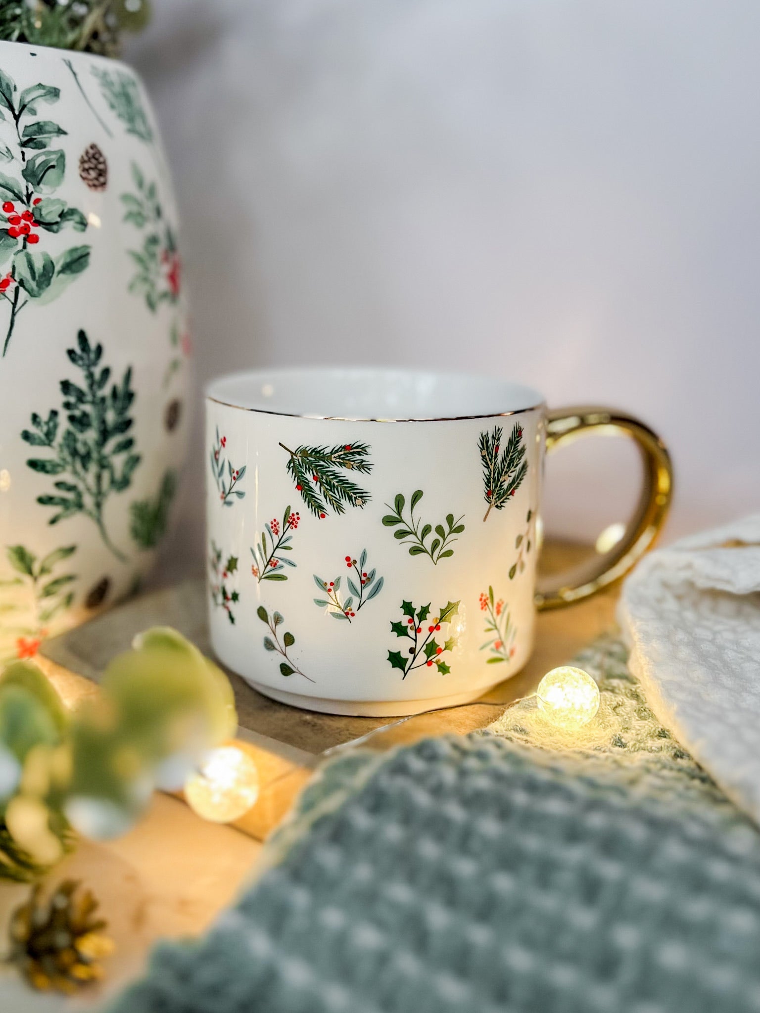Your morning coffee just got a festive upgrade. The Holly Jolly Botanical Mug features delicate holiday greenery illustrations—think holly, mistletoe, and pine—wrapped around a crisp white ceramic base, topped with a luxe gold handle and rim for a touch of glam.