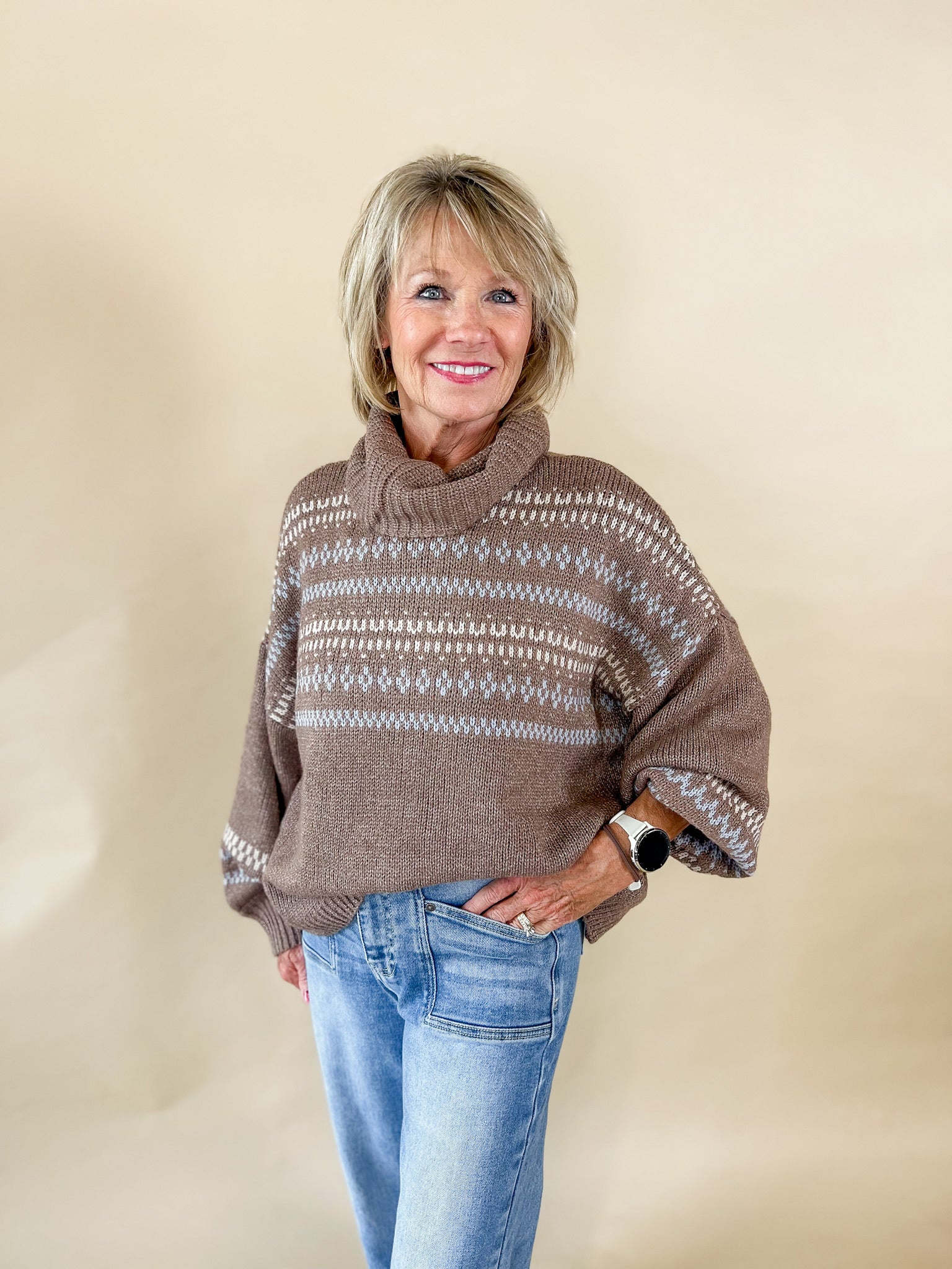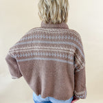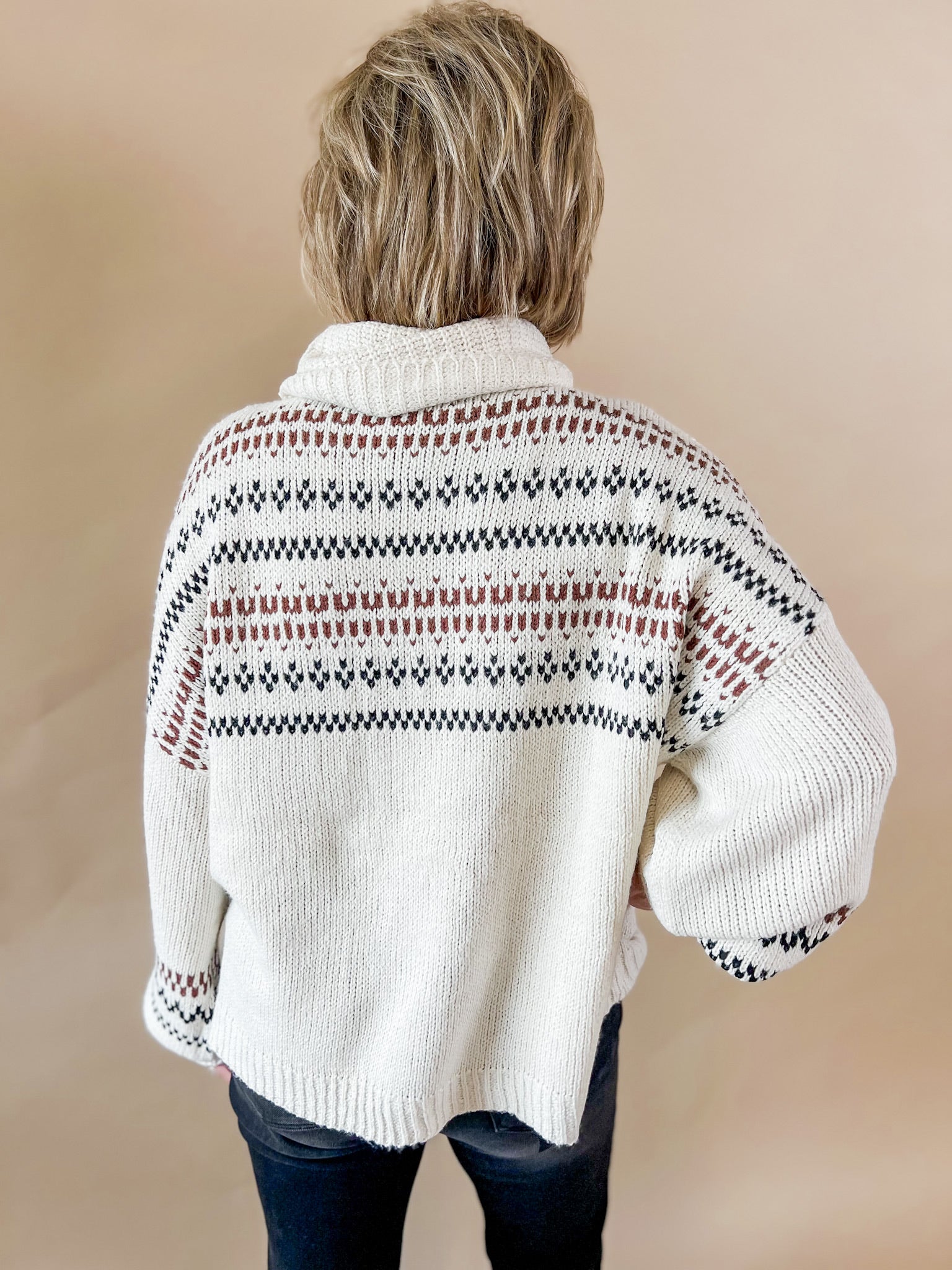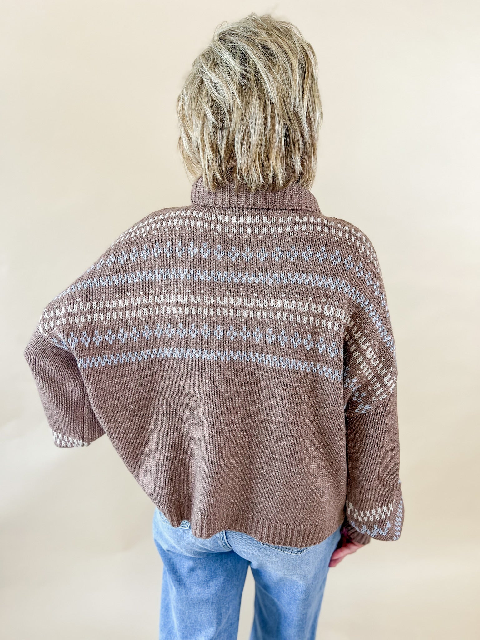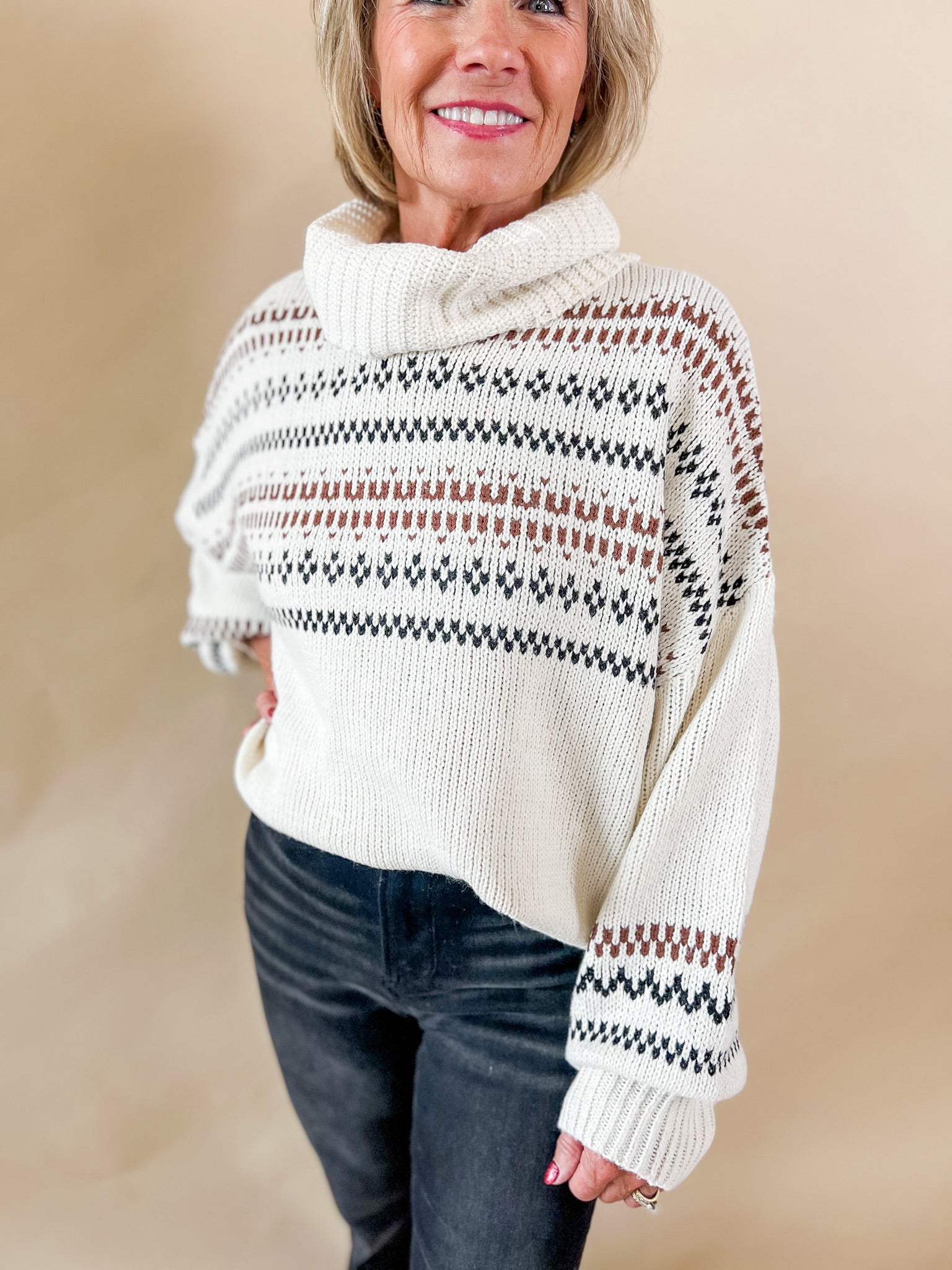 A modern twist on a winter classic. This cream knit turtleneck features a soft, breathable weave and subtle fair isle-inspired patterning in warm brown and black tones. Dress it up with denim or layer it under a vest for instant seasonal charm.