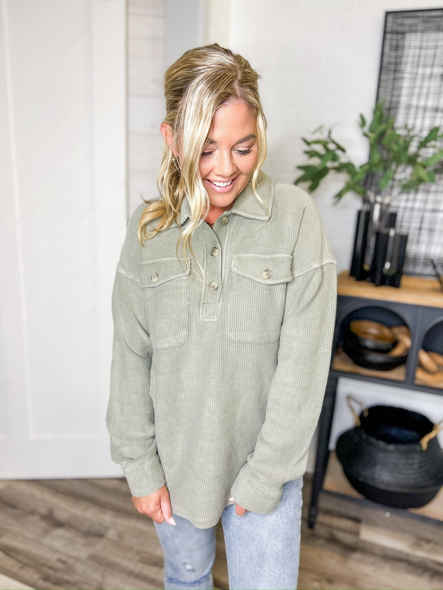This waffle fabric features a collared neckline, dual-chest pockets and shirt-tail hem. It would be darling paired with skinny jeans or leggings and a pair of boots!