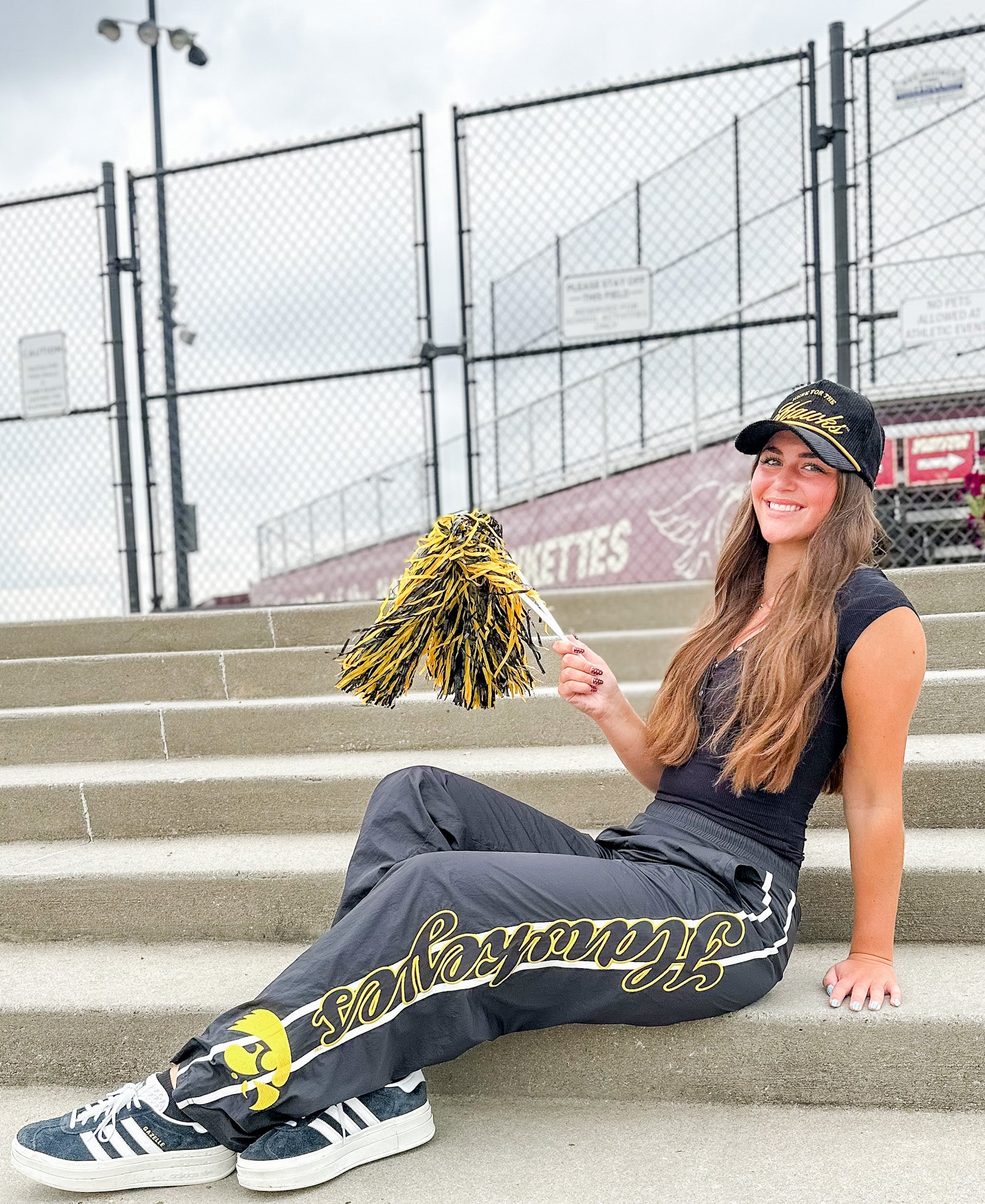 Show up game-day ready (or just comfy-cute for errands) with our Hawkeye Spirit Track Pants. These lightweight black pants feature bold gold “Hawkeyes” lettering down the leg and a relaxed, straight-leg fit that keeps you moving with ease. Pair them with your favorite tee, crop top, or hoodie for an effortlessly sporty look that screams Black & Gold pride.
