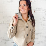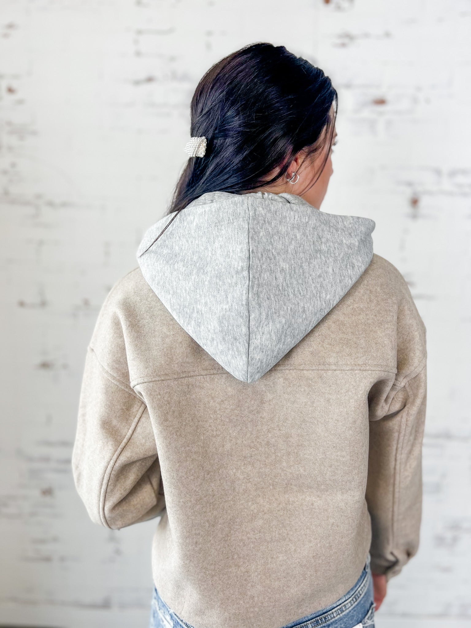 A closet essential with a twist. This cropped utility-style jacket features bold buttons, front pockets, and a cozy hood you can remove for two looks in one. Chloe is 5'7" wearing a size small, and the fit is true to size.