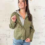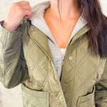 An instant fall favorite. This olive quilted jacket is lightweight yet cozy, with roomy front pockets and a detachable hood for versatile wear. Perfect for layering over your go-to basics all season long. Chloe is 5'7" wearing a size small, and the fit is true to size.