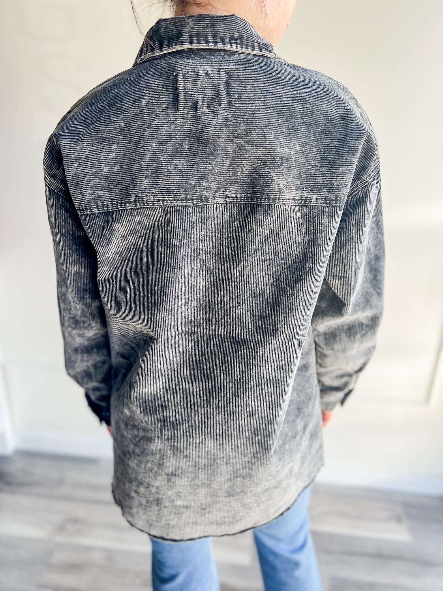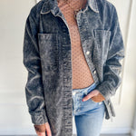 The Washed Black Corduroy Button Down Shacket brings texture and personality with its washed finish, long-line silhouette, and functional pockets. Chloe is 5'7 wearing her true size small, showing off the relaxed fit you can wear buttoned or open depending on your day.
