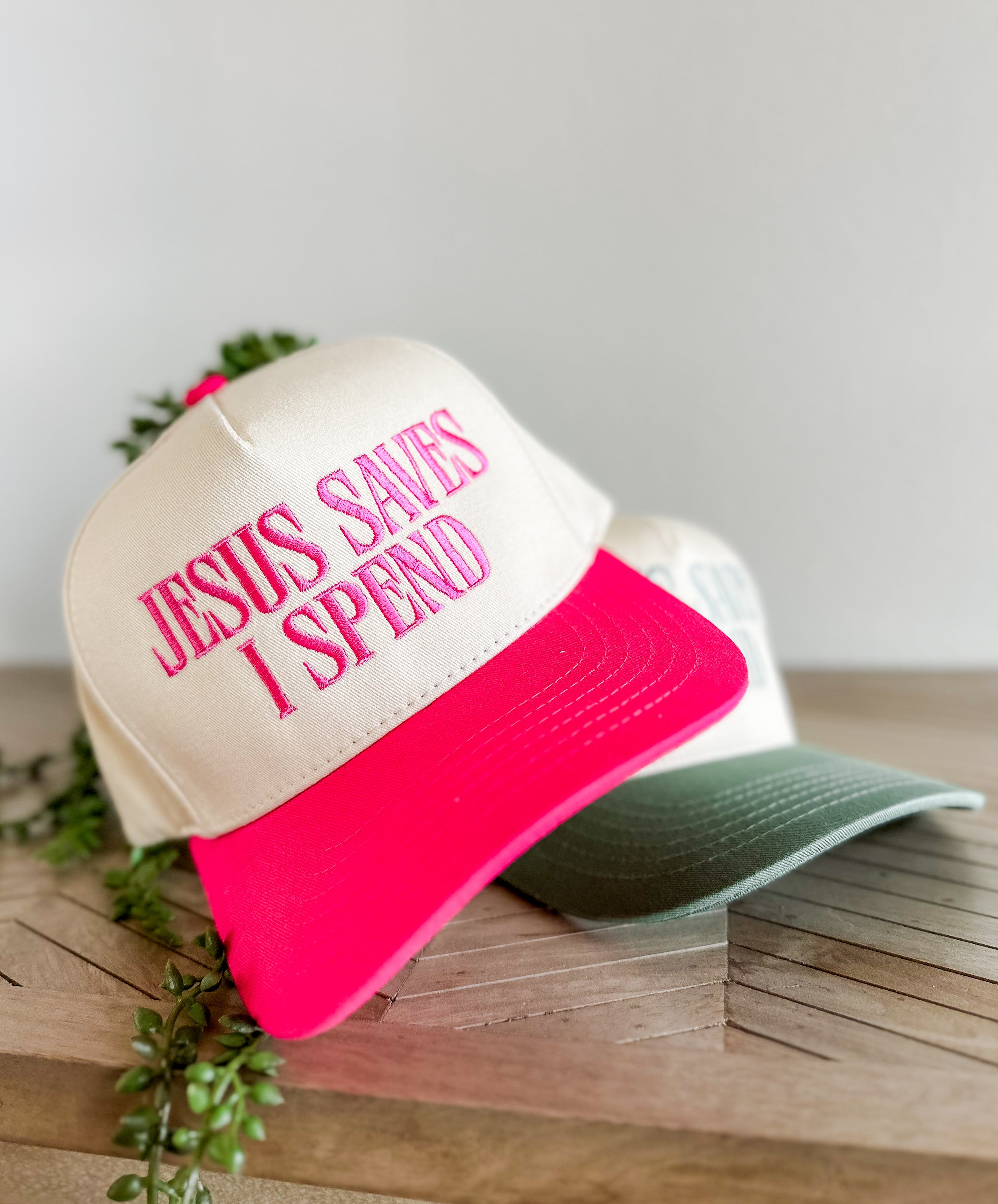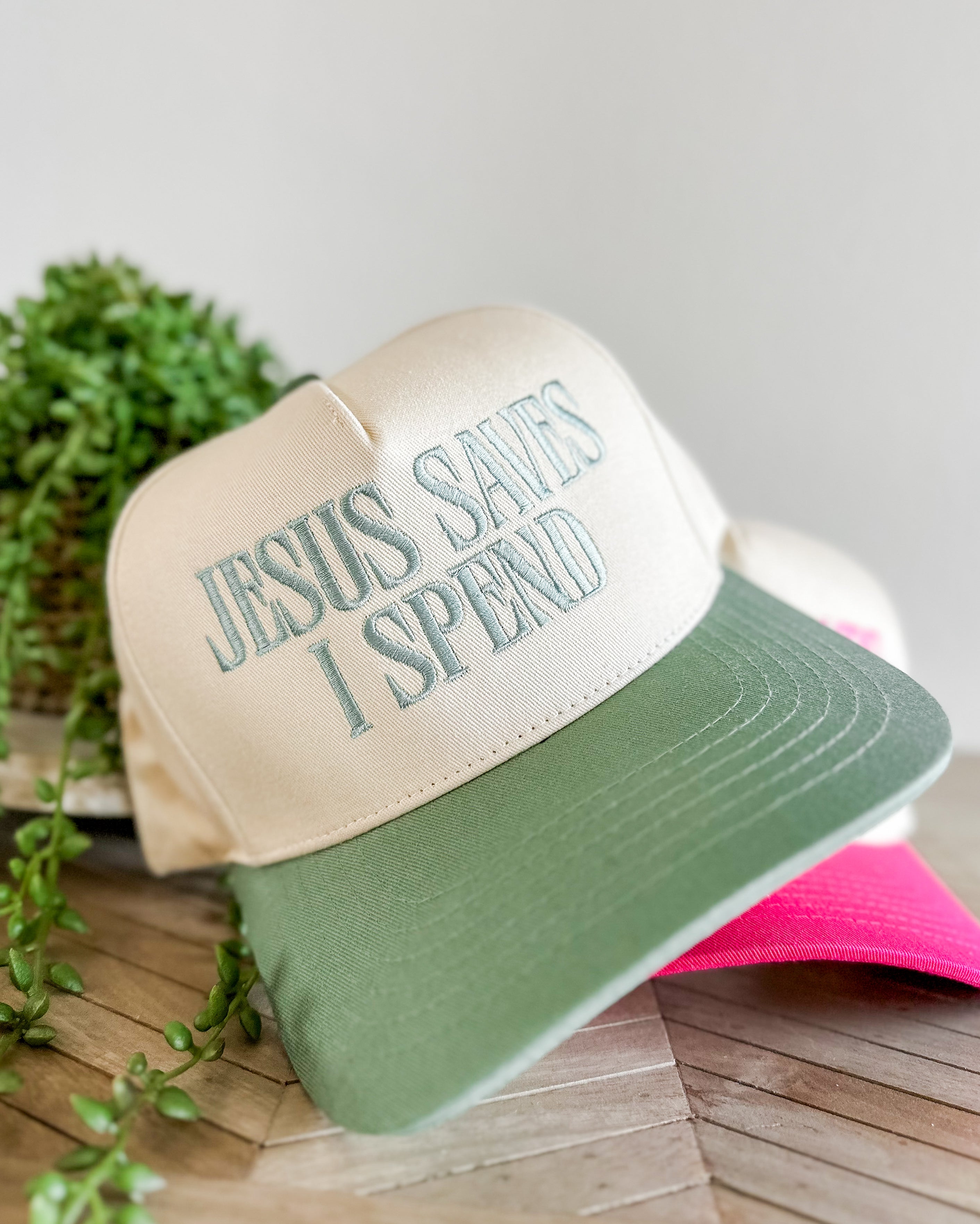 Save in style with the "Jesus Saves, I Spend" hat! Perfect for any casual occasion, this hat adds a touch of fun to your look.