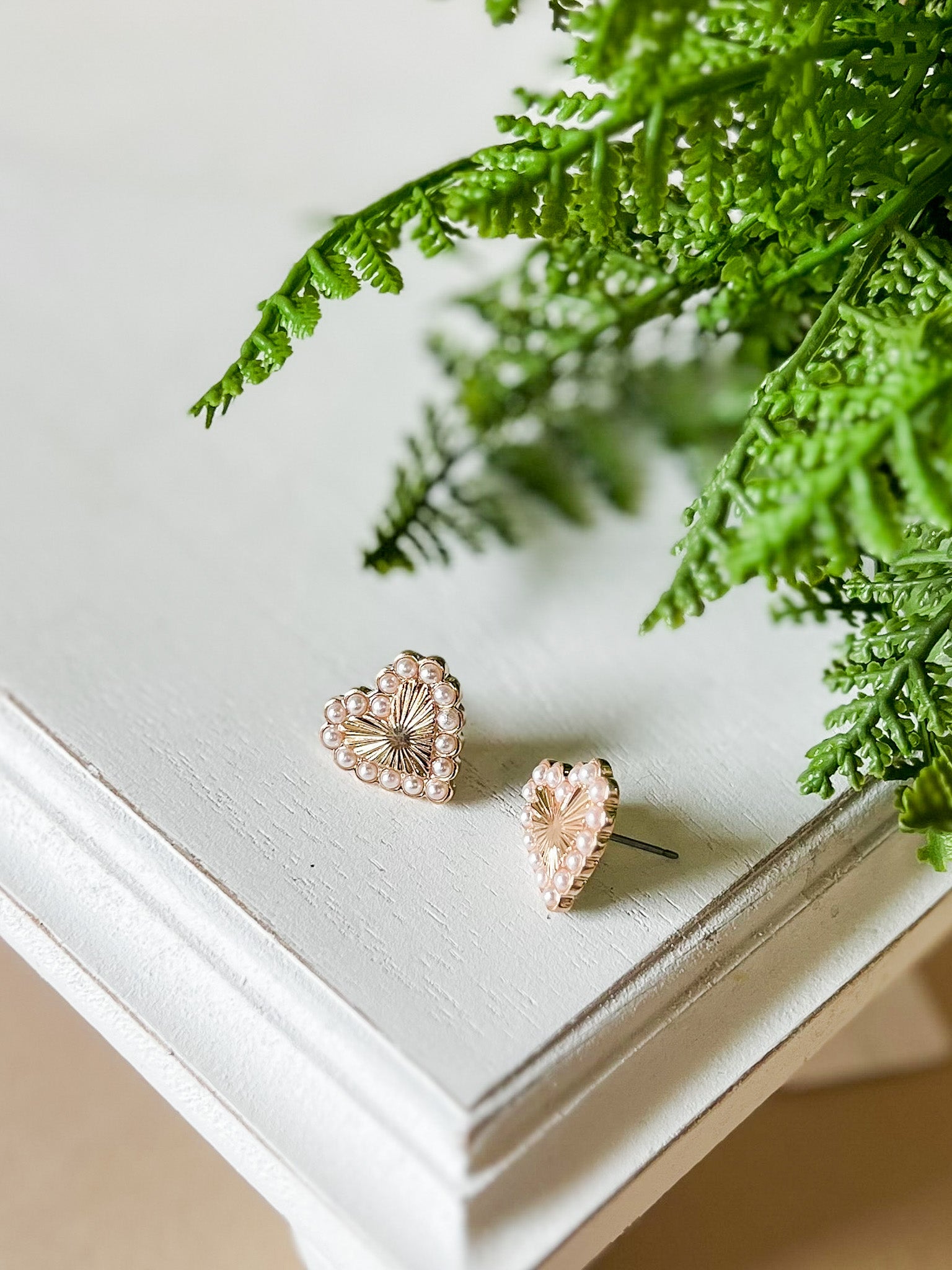 These pearl heart stud earrings feature a delicate heart shape outlined with small pearl details and a soft gold-tone center. The textured design adds just a little interest while keeping the look classic and easy. A pretty option for everyday wear or gifting.