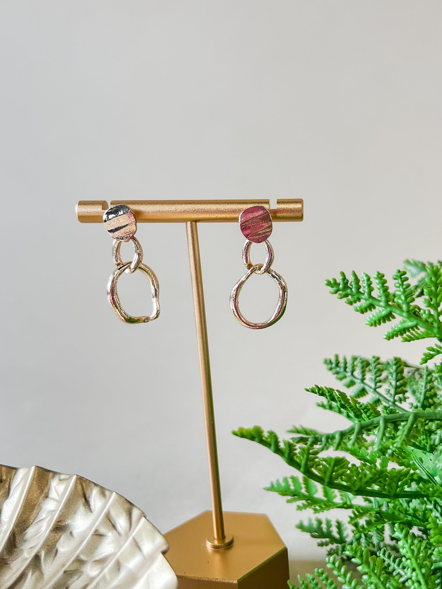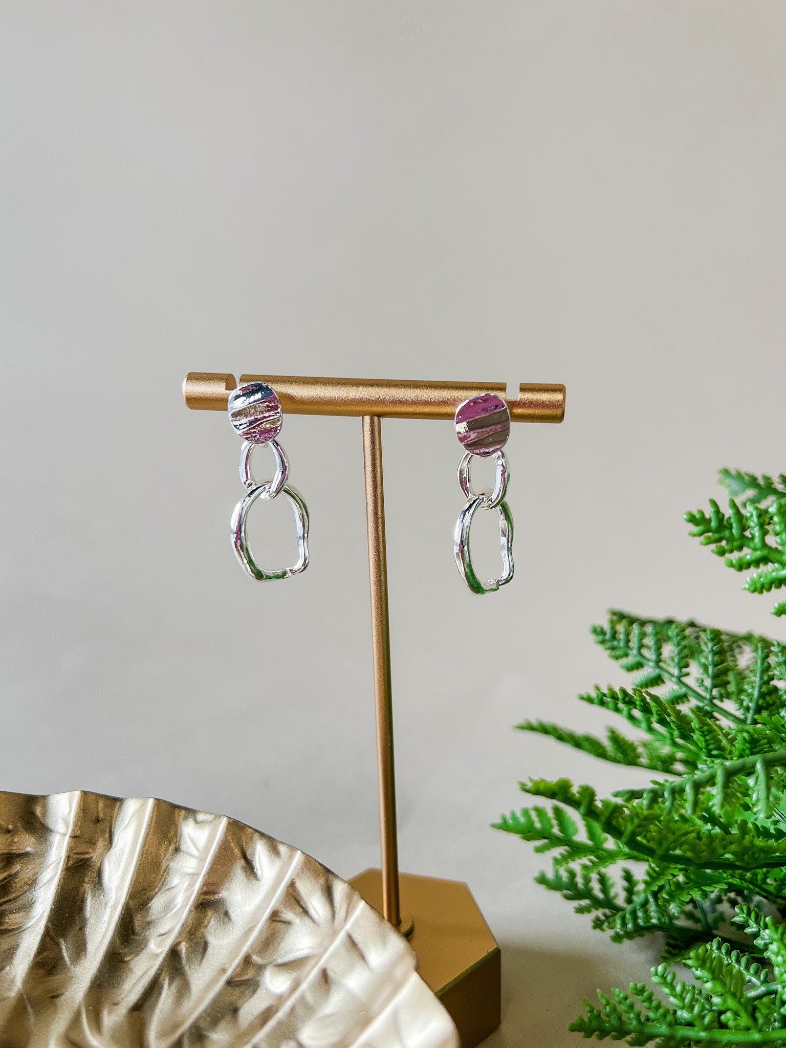 These drop earrings feature a softly hammered stud paired with a linked oval drop for an easy, modern look. The textured finish adds subtle dimension while the lightweight design allows for comfortable all-day wear. A simple statement that works effortlessly from casual to dressed up.