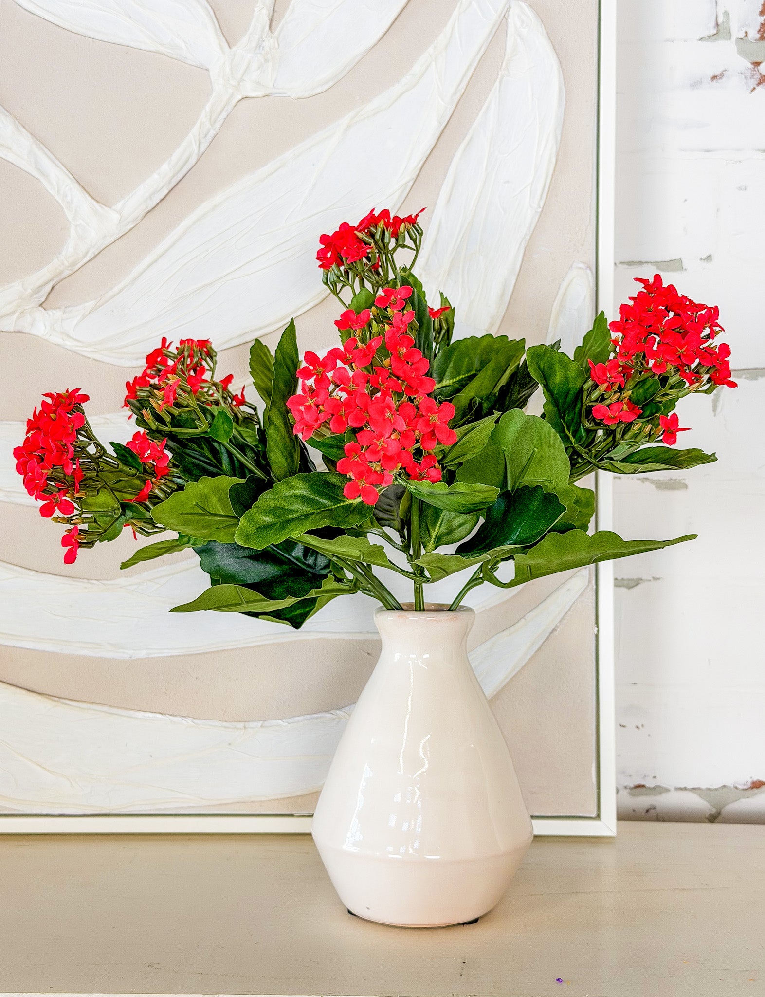 This faux kalanchoe bush adds an instant fresh touch to your space with lifelike leaves and clustered blooms that feel full and natural. It’s an easy way to bring a bit of life to shelves, consoles or tabletops without any maintenance, making it perfect for everyday styling in any season.