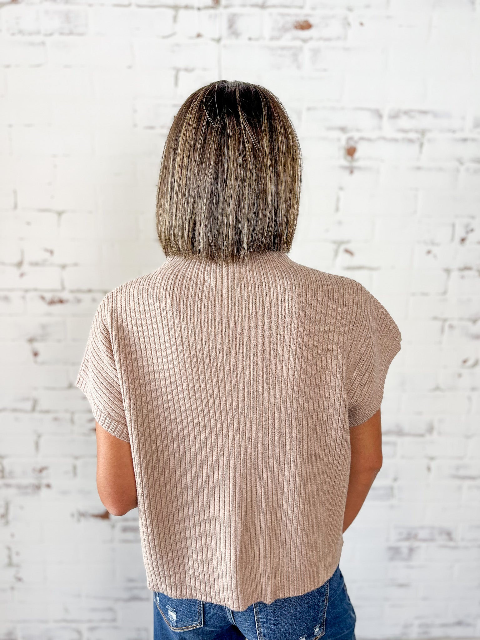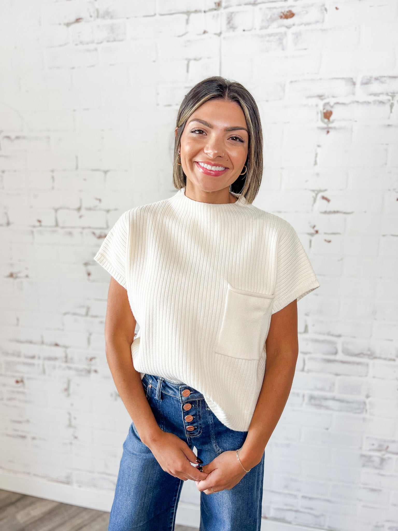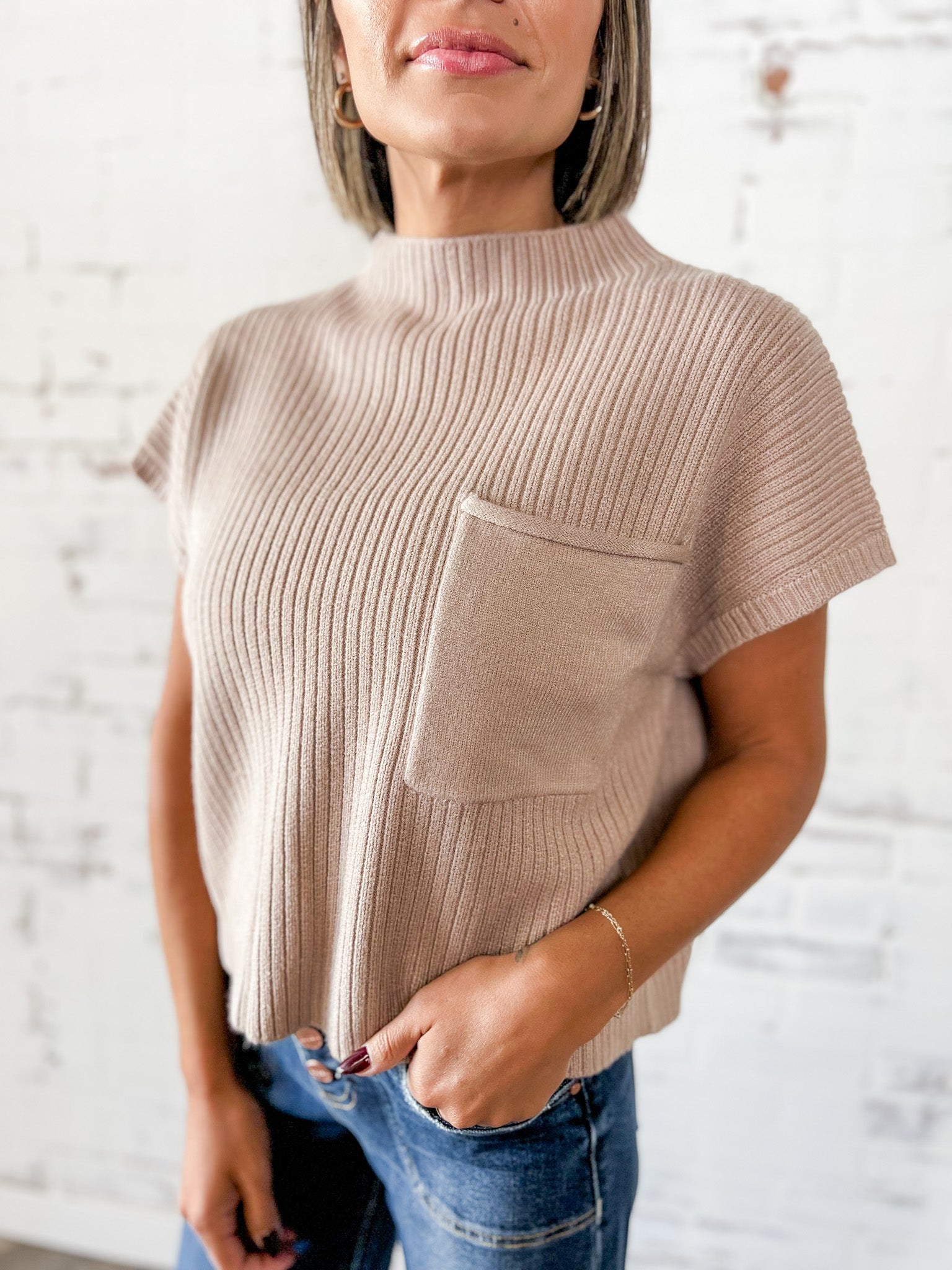 Classic, cozy, and so easy to style — this ribbed mock neck top is a true wardrobe essential. The soft knit blend offers the perfect stretch while the boxy fit keeps it effortlessly chic. A front pocket detail adds that extra touch of casual cool. Perfect for pairing with denim, layering under jackets, or dressing up with statement jewelry. Available in taupe and ivory.