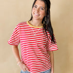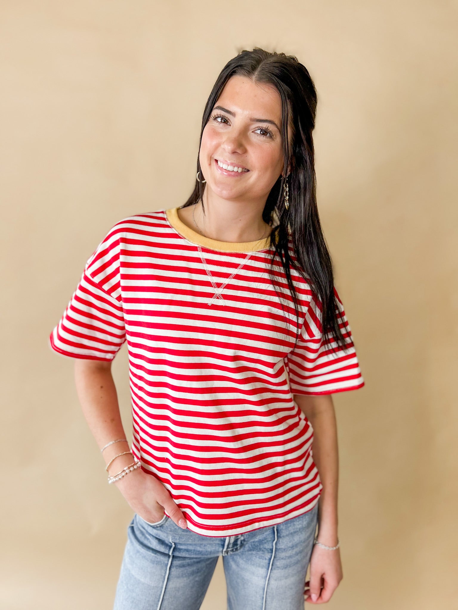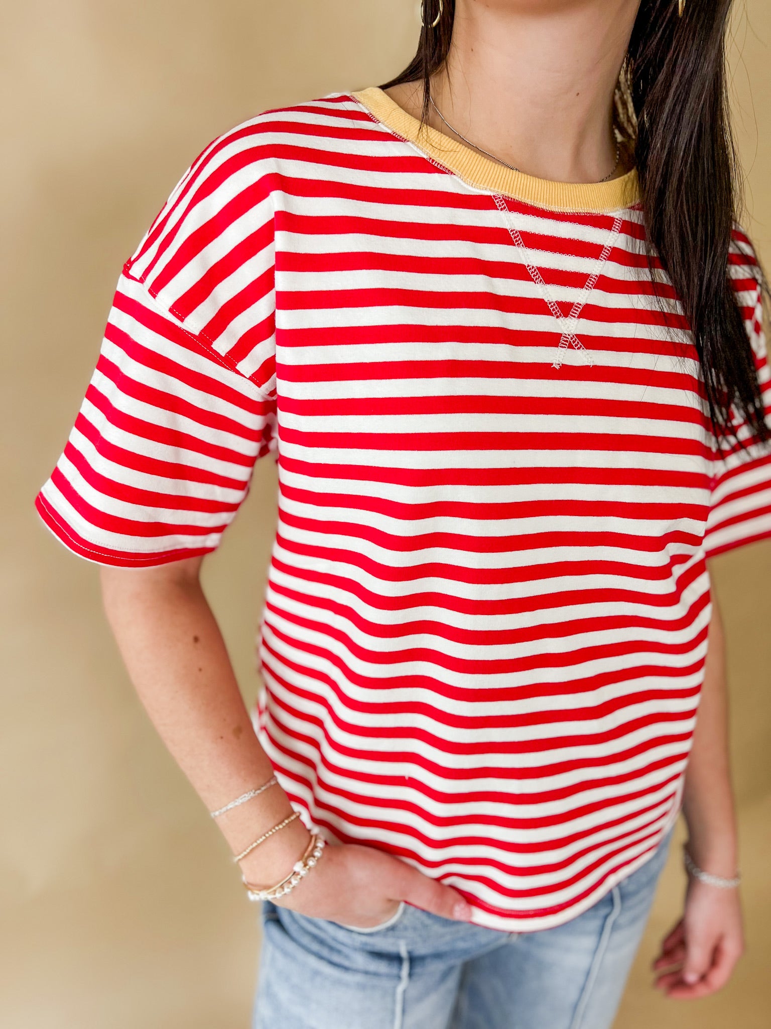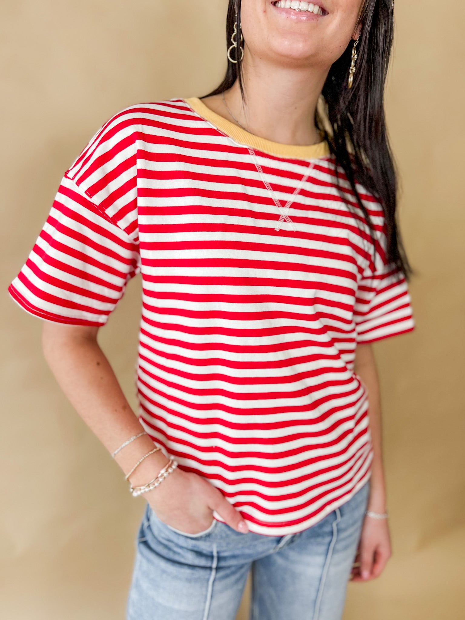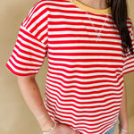 Classic stripes with a pop of personality. This tee is easy, cheerful and made for everyday wear — the kind you grab on busy mornings and still feel good about all day long. The red-and-cream stripe combo adds just enough fun while the relaxed fit keeps things effortless.