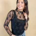 Elegant, edgy, and perfect for a night out. This black lace mesh top brings all the drama with its sheer sleeves, delicate floral pattern, and flattering fitted shape. Layer it under dresses, pair it with denim, or dress it up with a skirt — it’s a total showstopper. Chloe is 5’7” and wearing a size small.