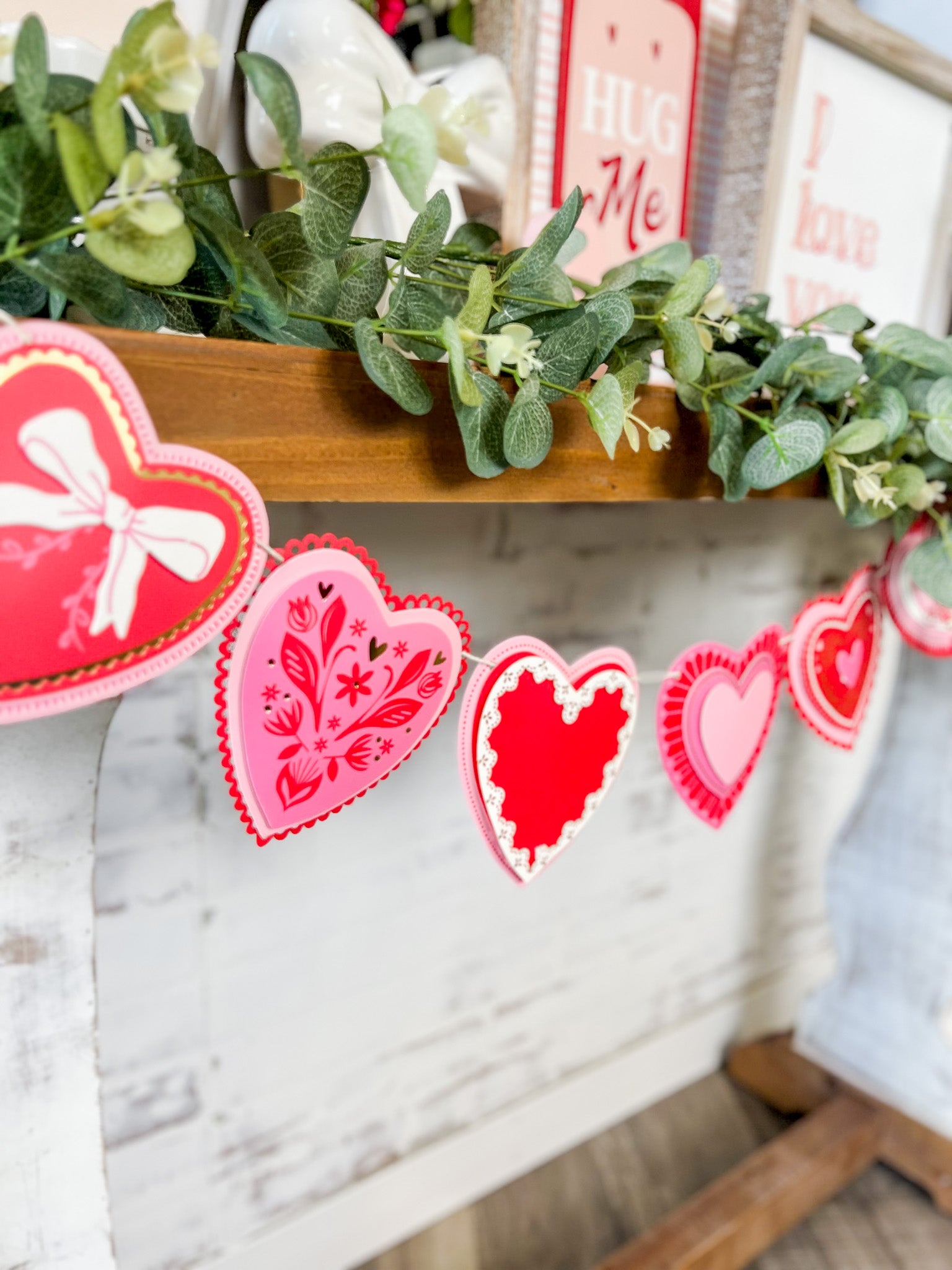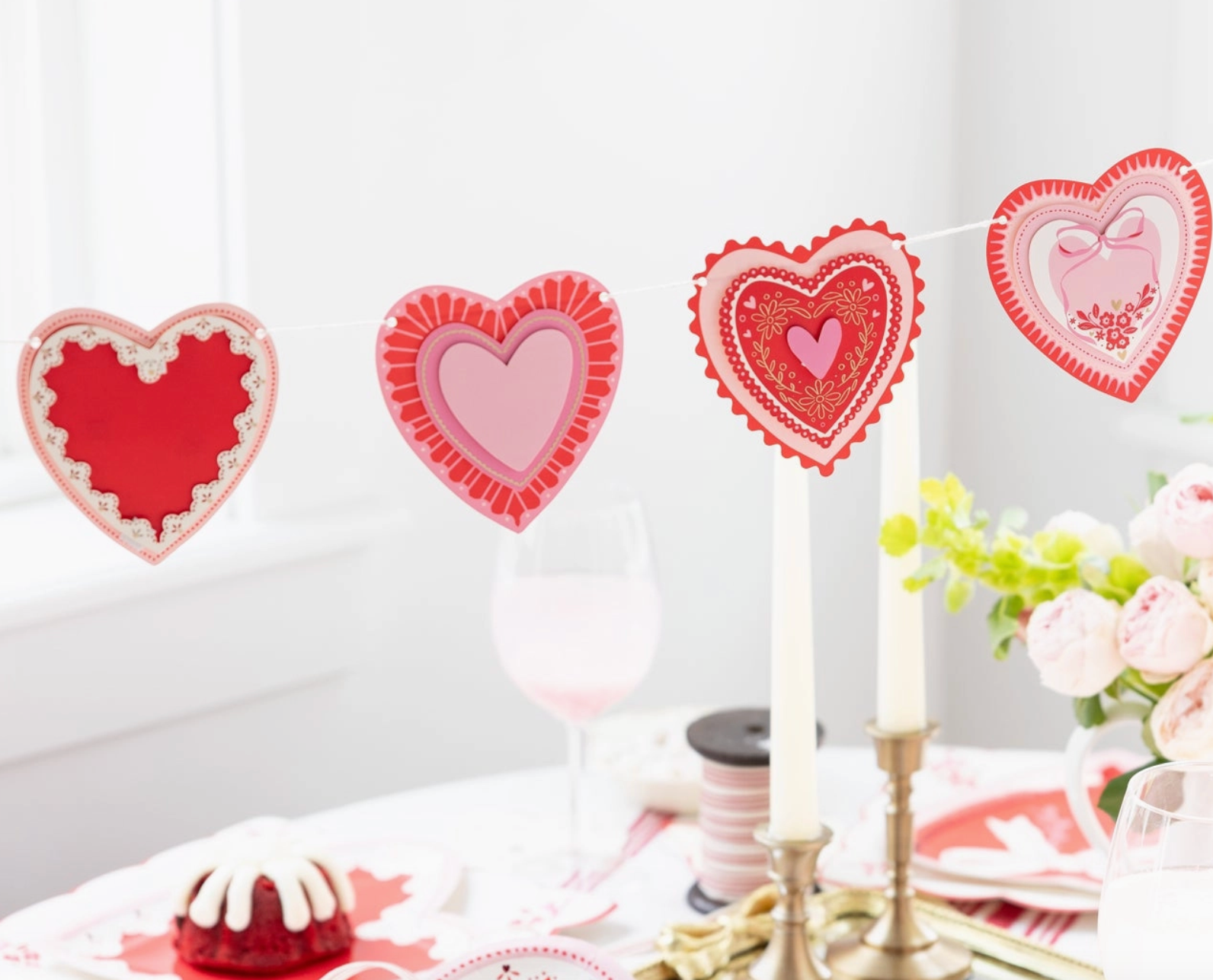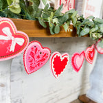 This layered heart banner adds instant warmth to mantels, tables and party spaces. Featuring soft pinks, reds and delicate details, it’s perfect for Valentine decorating, Galentine gatherings or any moment that calls for a little extra love.