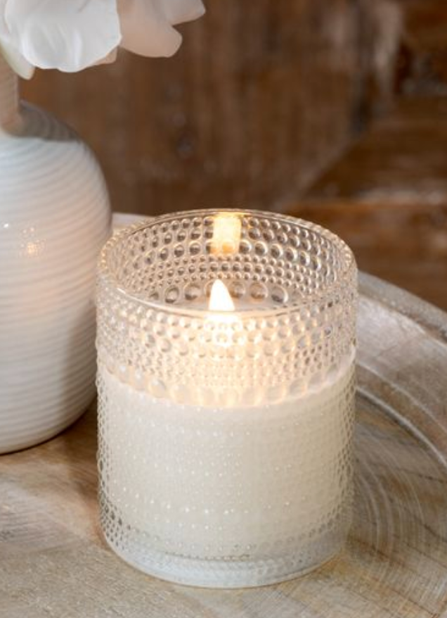 A soft glow with a little extra detail—this textured glass candle is one of those pieces that instantly makes a space feel cozy. The raised dot pattern catches the light beautifully, creating a warm, inviting ambiance whether it’s lit or not.