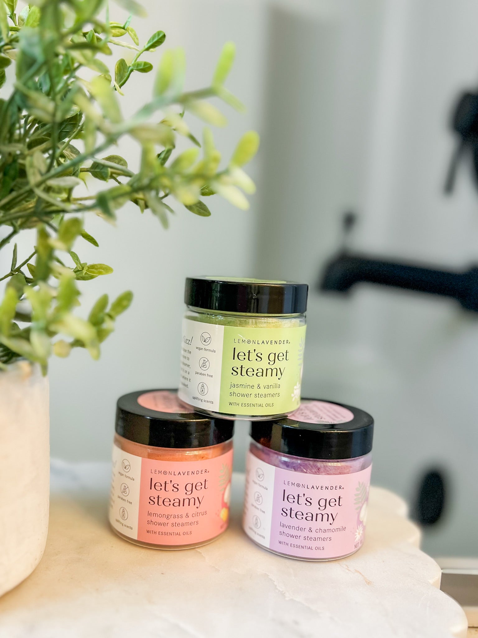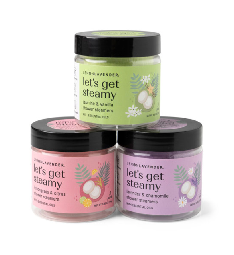 Need to relax and short on time? Packed with two kinds of essential oils, these in-shower steamers let you reset and unwind without sacrificing time for snoozing or scrolling. Set on a ledge where it’s sure to get splashed and breathe deep while you wash up. Each jar is packed with three individually wrapped steamers, in three scent duos: jasmine & vanilla, lavender & chamomile and lemongrass & citrus.