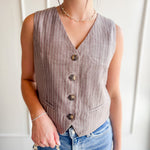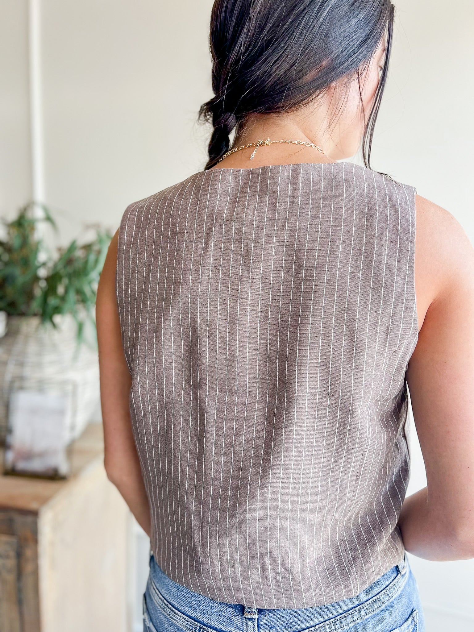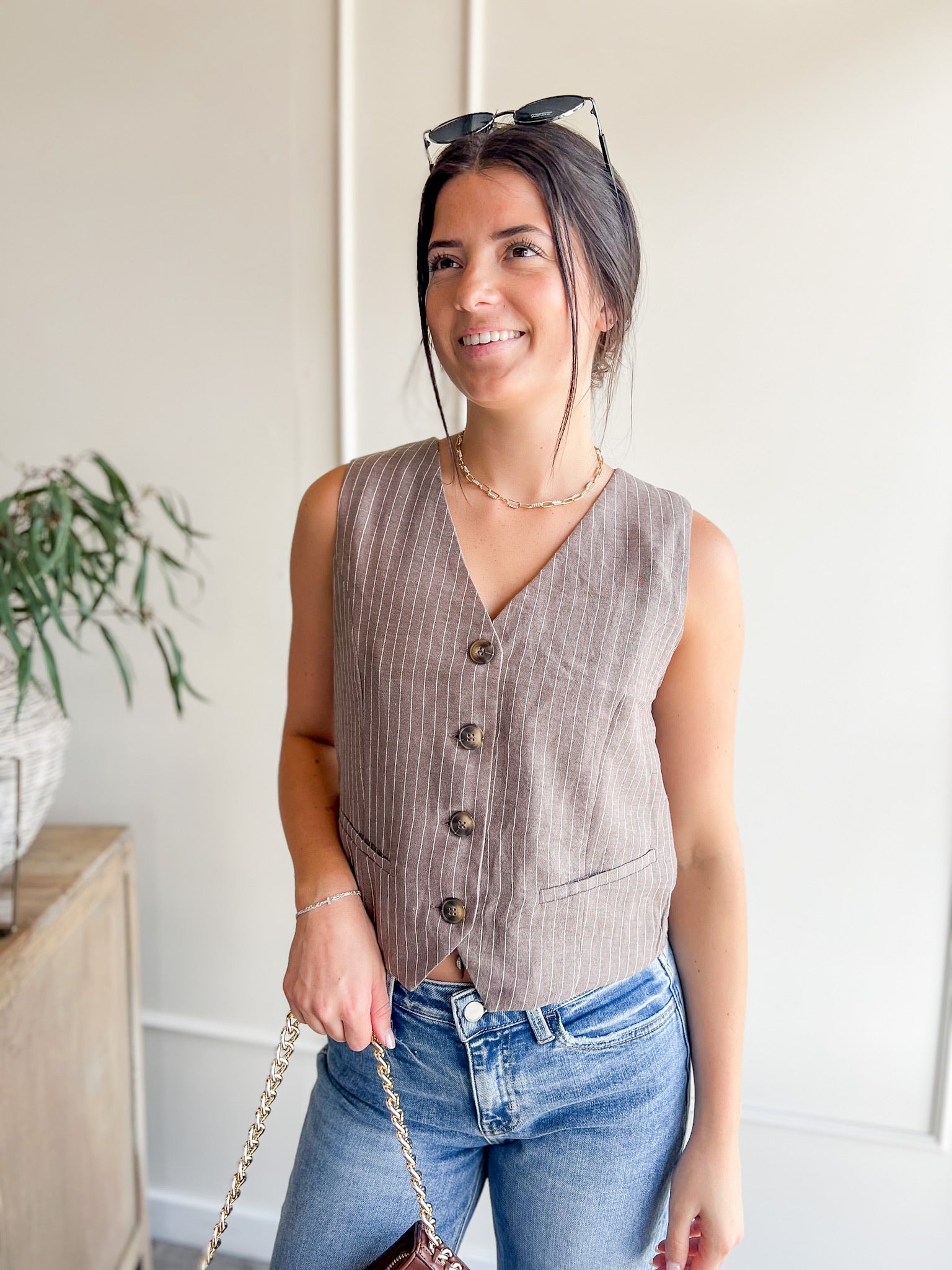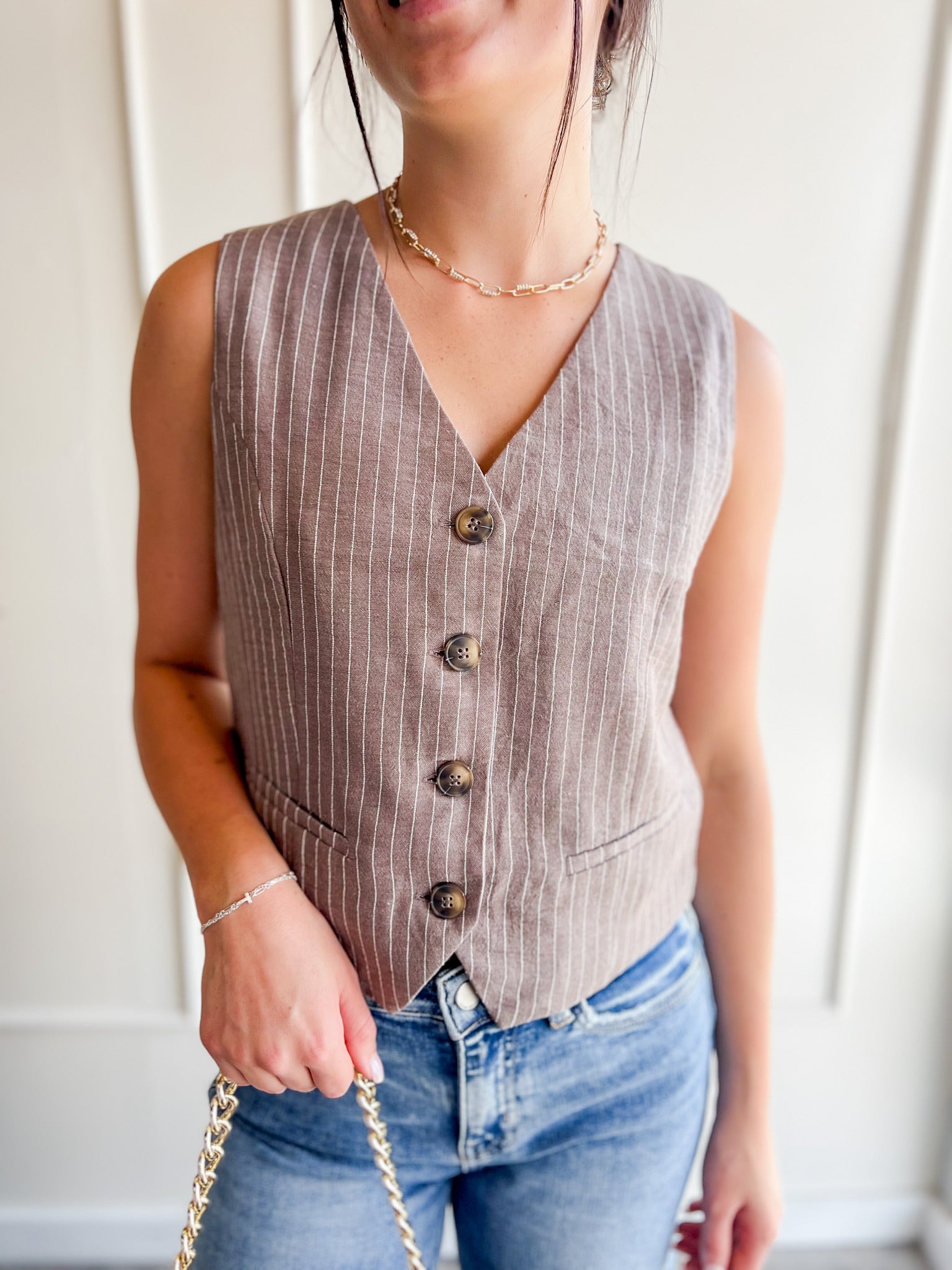 Channel those boss-babe vibes with the Power Move Pinstripe Vest. This tailored piece takes classic menswear-inspired style and gives it a chic, feminine twist. With its sharp v-neckline, button front, and subtle pinstripe pattern, it’s the perfect layering piece to dress up denim or polish off trousers.
