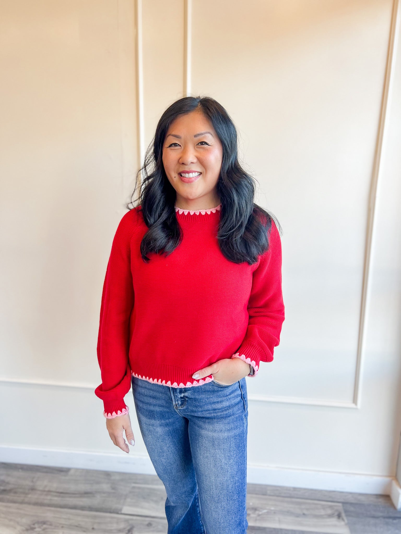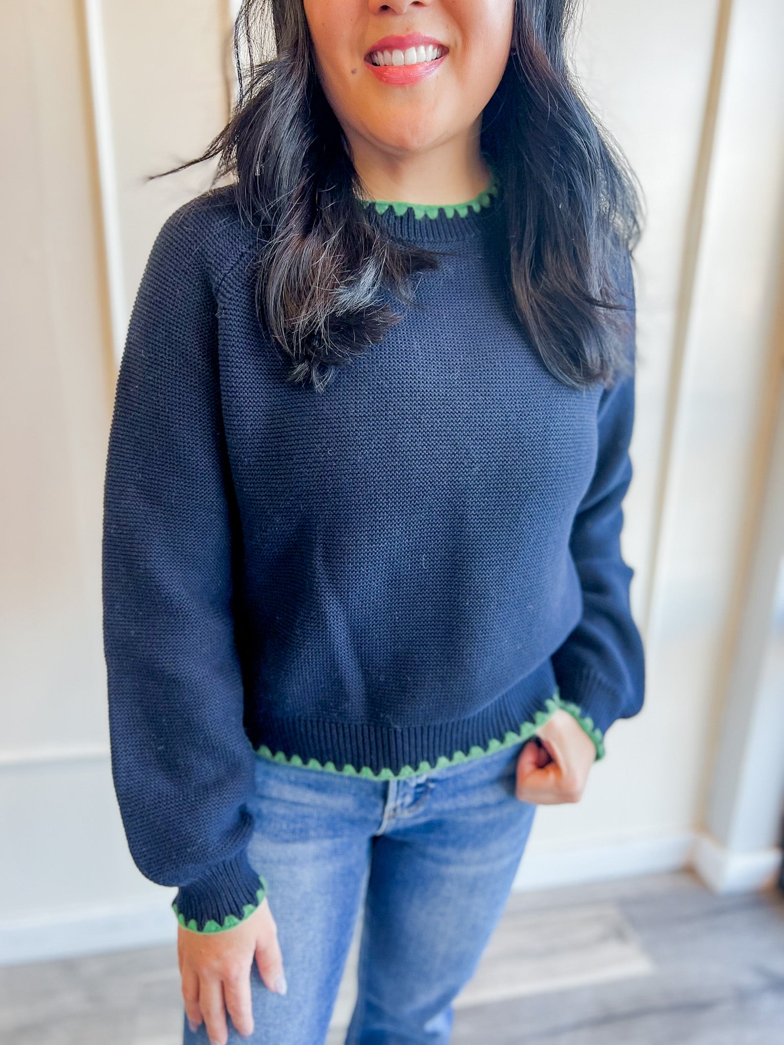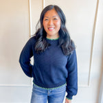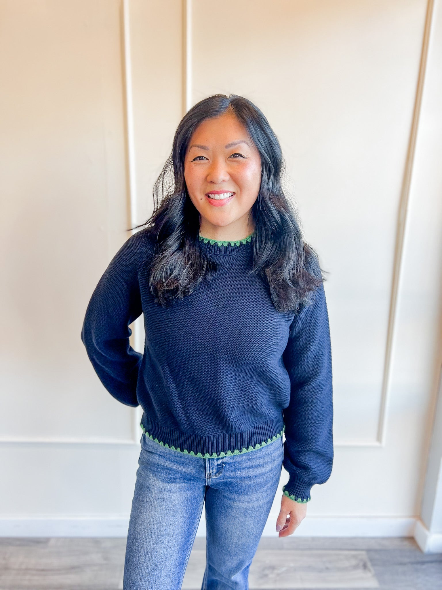 This long puff sleeve sweater is a cozy classic with just enough detail to make it feel special. The contrast stitching adds a subtle pop that elevates the look without taking away from its everyday wearability. It’s an easy piece to reach for when you want something comfortable, polished and effortlessly put together.