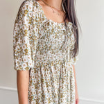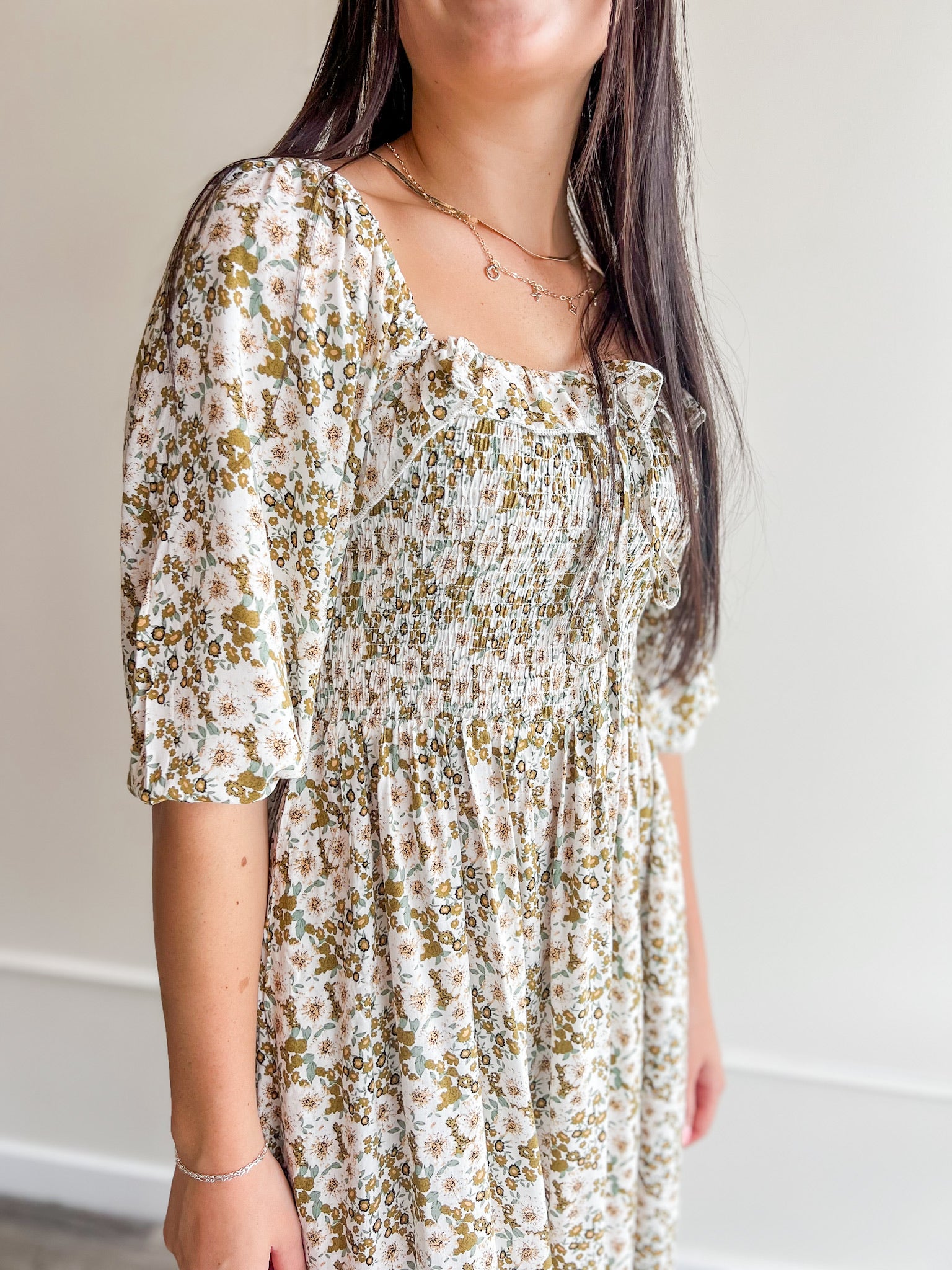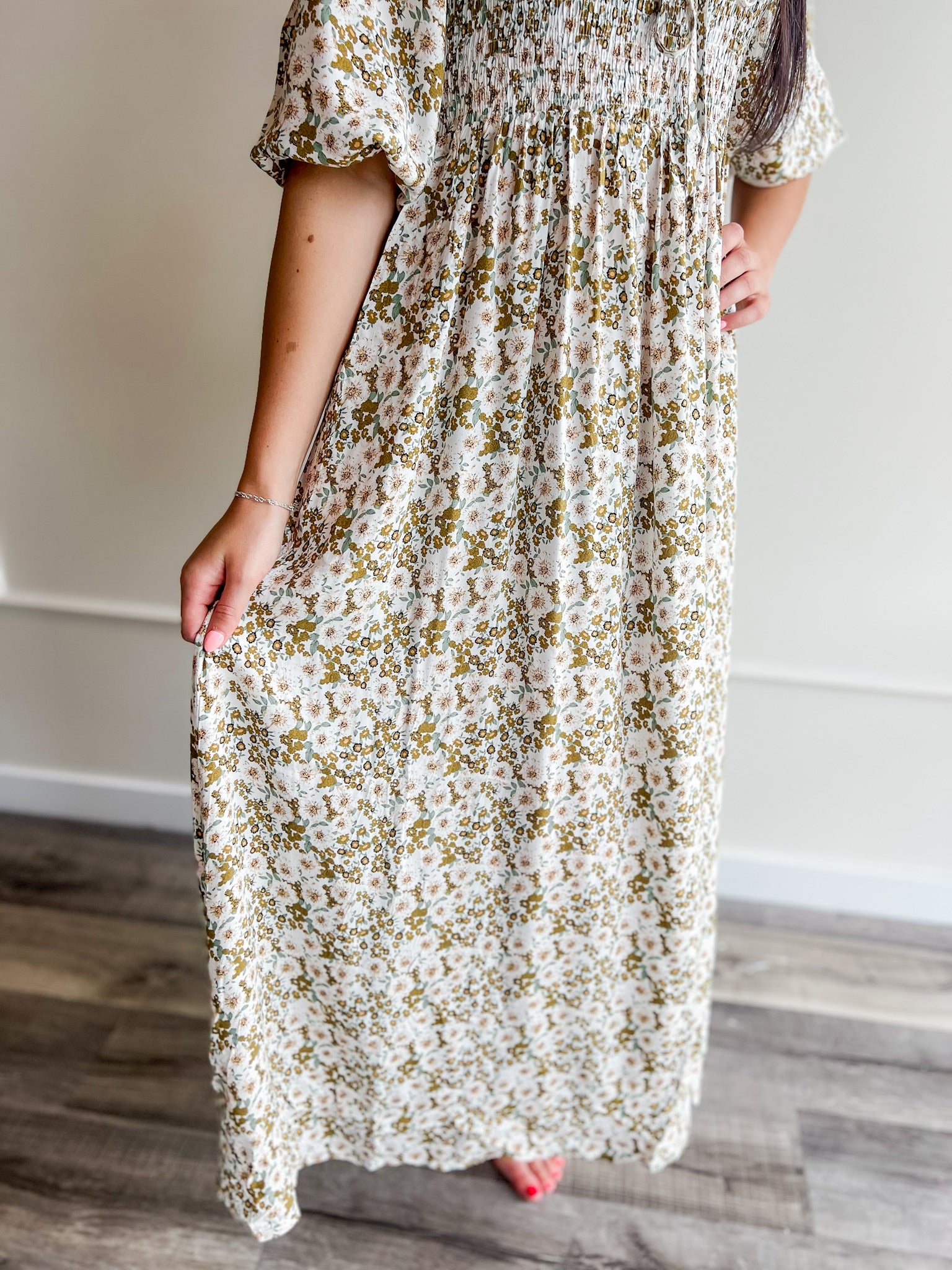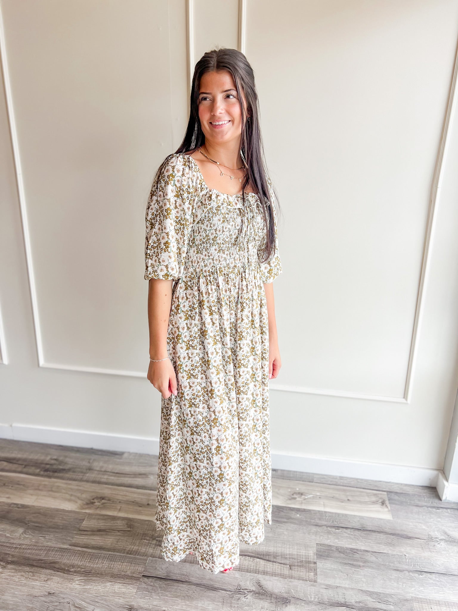 Dreamy and delicate with just the right touch of vintage charm—this smocked floral maxi is made for golden hour strolls and fall photo ops. The floaty fit, muted tones, and flattering neckline make it a must-have for any season.