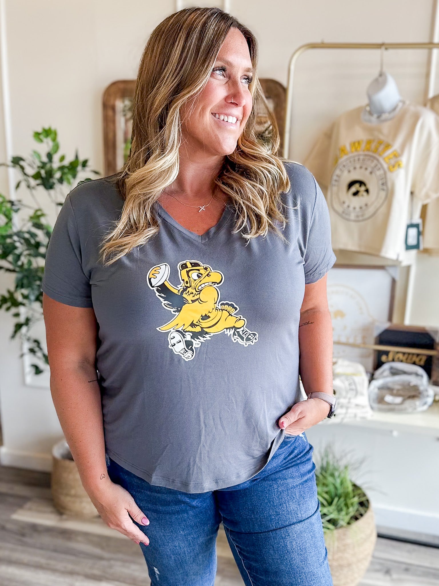 Bring back the old-school vibes with our retro mascot bamboo tees, available in both Iowa Hawkeyes and Iowa State Cyclones. Made with a silky-soft bamboo blend, this v-neck tee keeps you comfy while repping your team in vintage style. Perfect for tailgates, watch parties, or casual Saturdays, it’s the game-day staple you’ll wear on repeat.