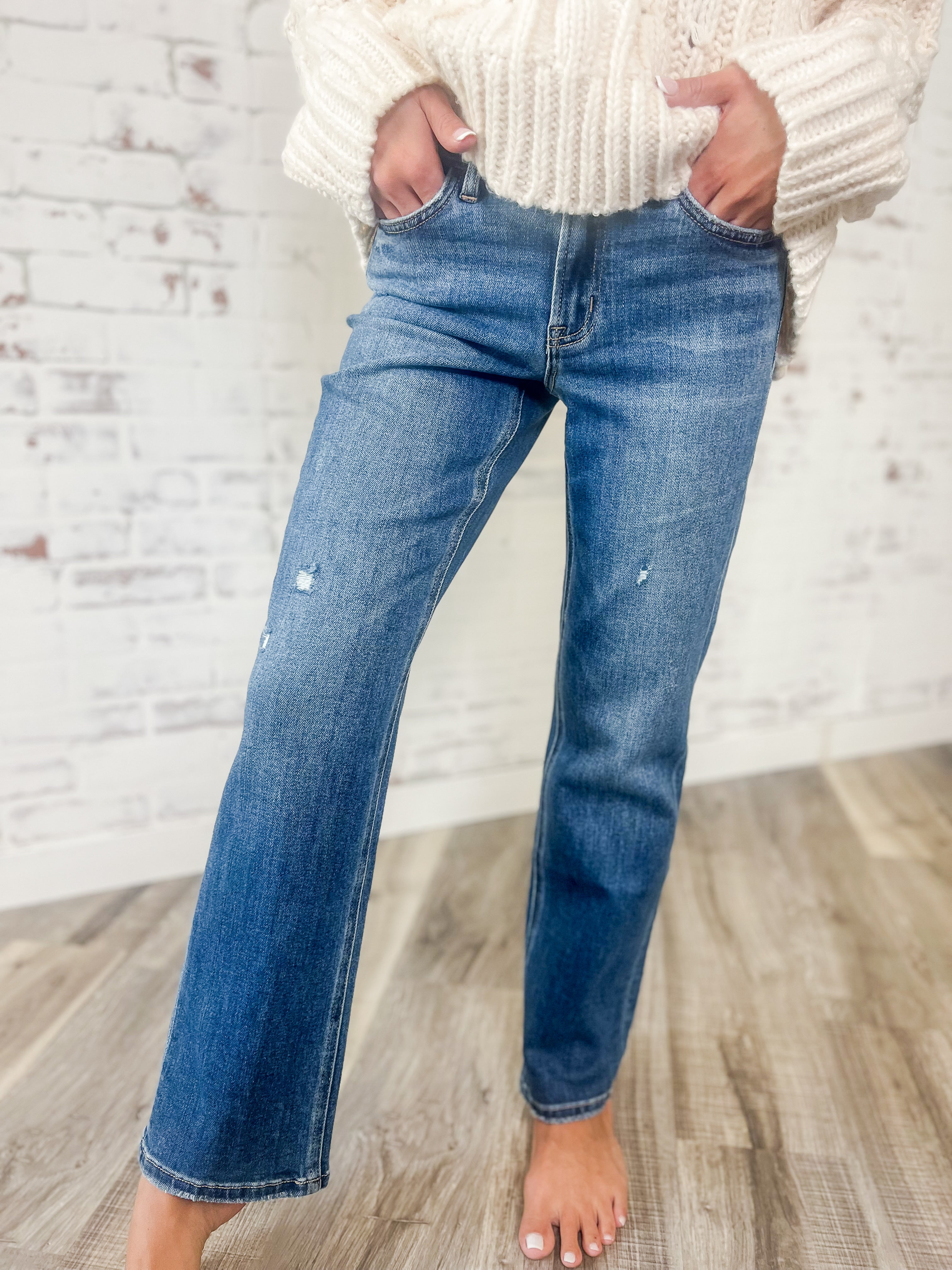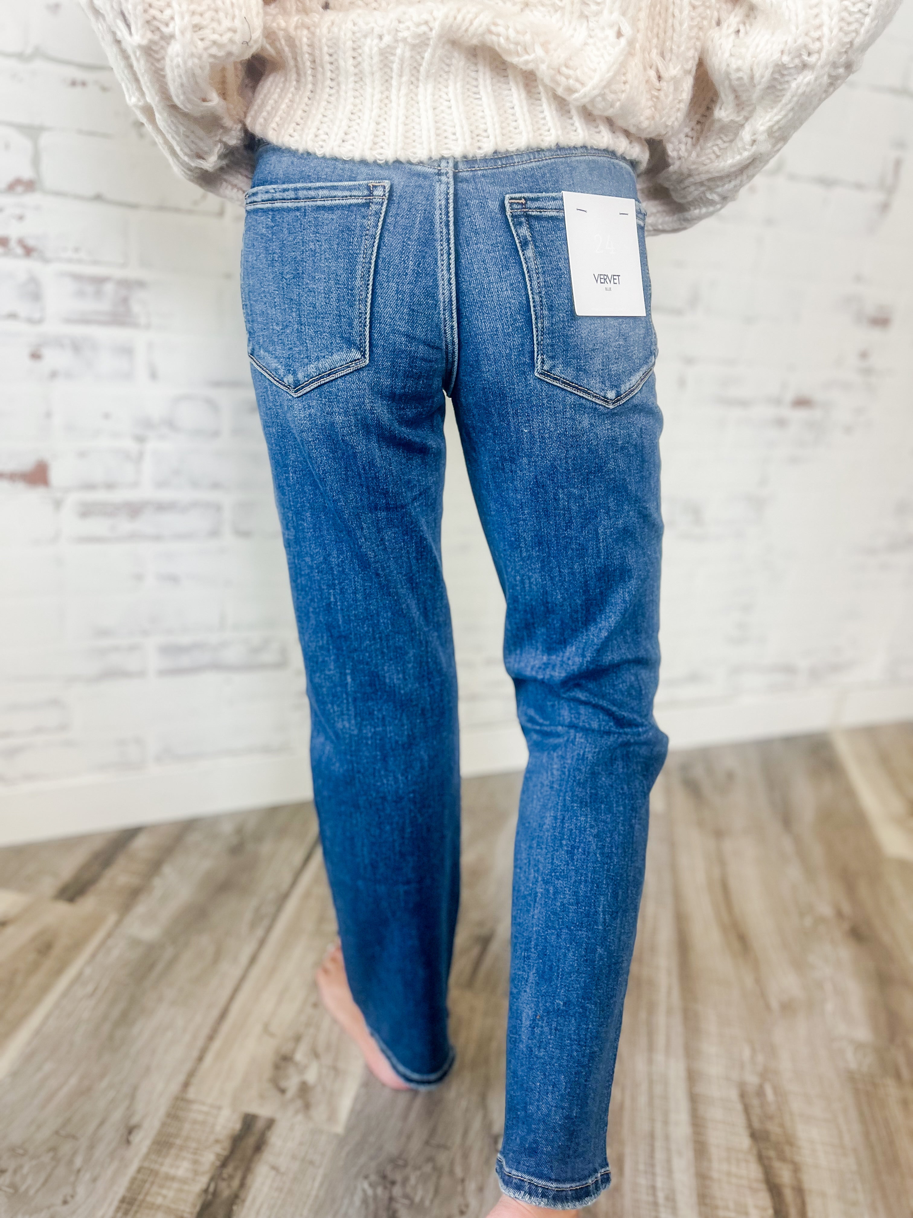 These slim straight jeans deliver that effortless everyday style your closet always needs. Made with comfort stretch denim, they offer the perfect balance of structure and give, keeping you comfortable through workdays errands weekends and everything in between. The mid rise waist sits just right while the subtle distressing adds a touch of lived-in charm without feeling too casual.