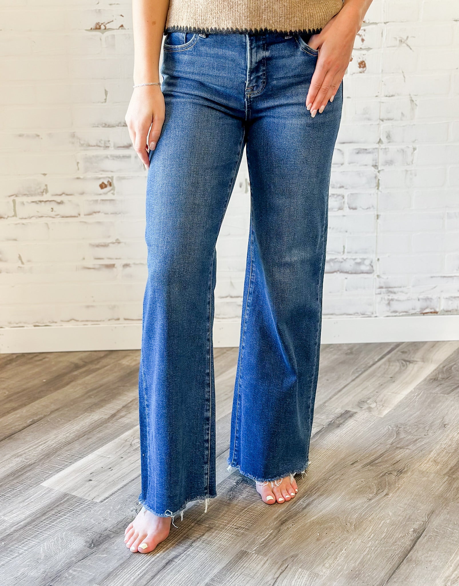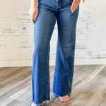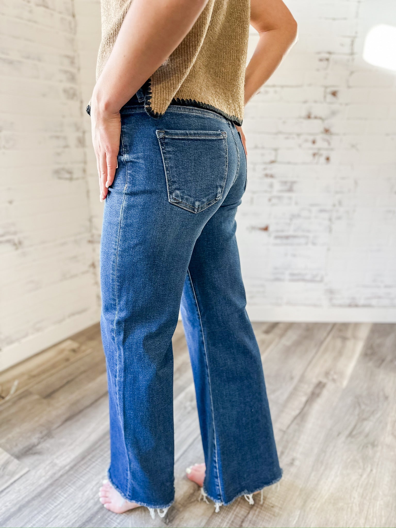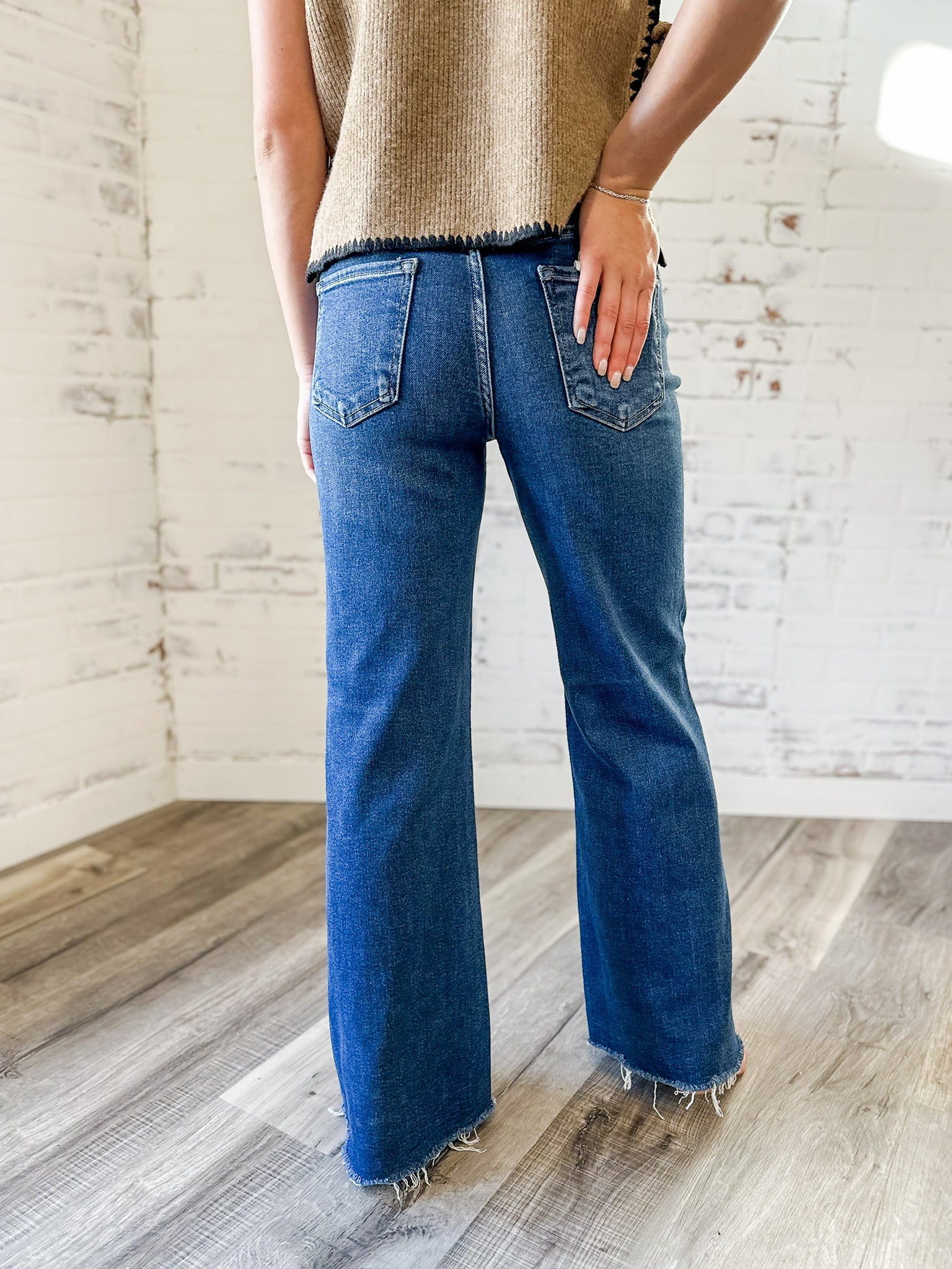 Classic flare, modern stretch. These dark wash jeans hug in all the right places and kick out at the bottom for that effortless, leg-lengthening look. Finished with a raw hem for just the right amount of edge — because your denim should work as hard as you do.