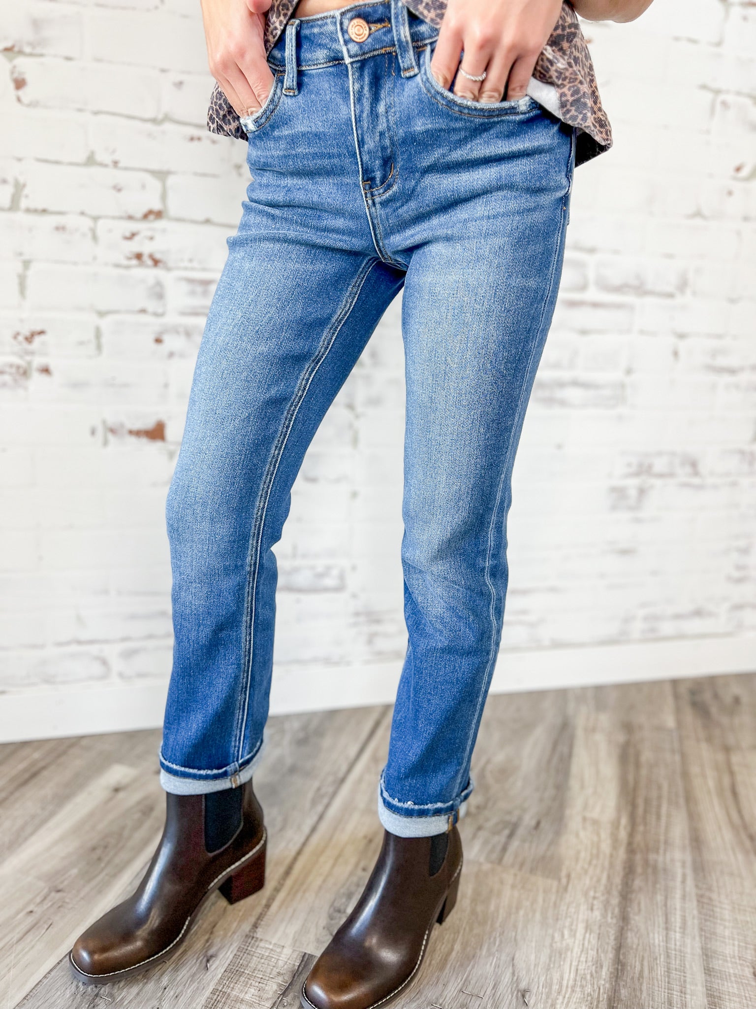 A classic straight-leg jean with an easy medium wash and just the right amount of stretch. Cuffed or uncuffed, these are your go-to jeans for everyday outfits — polished, comfy and endlessly wearable.