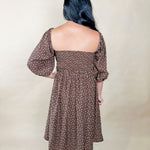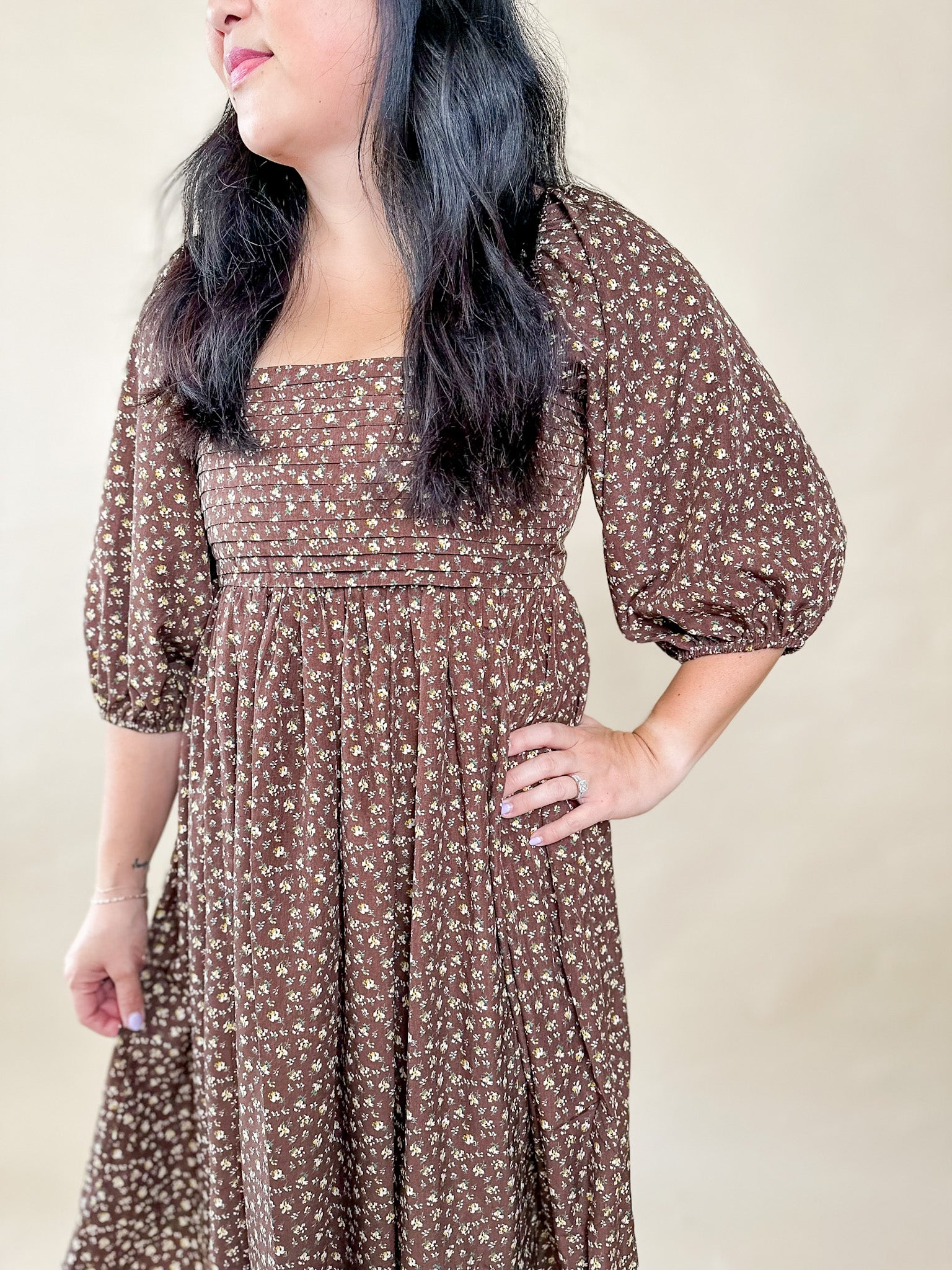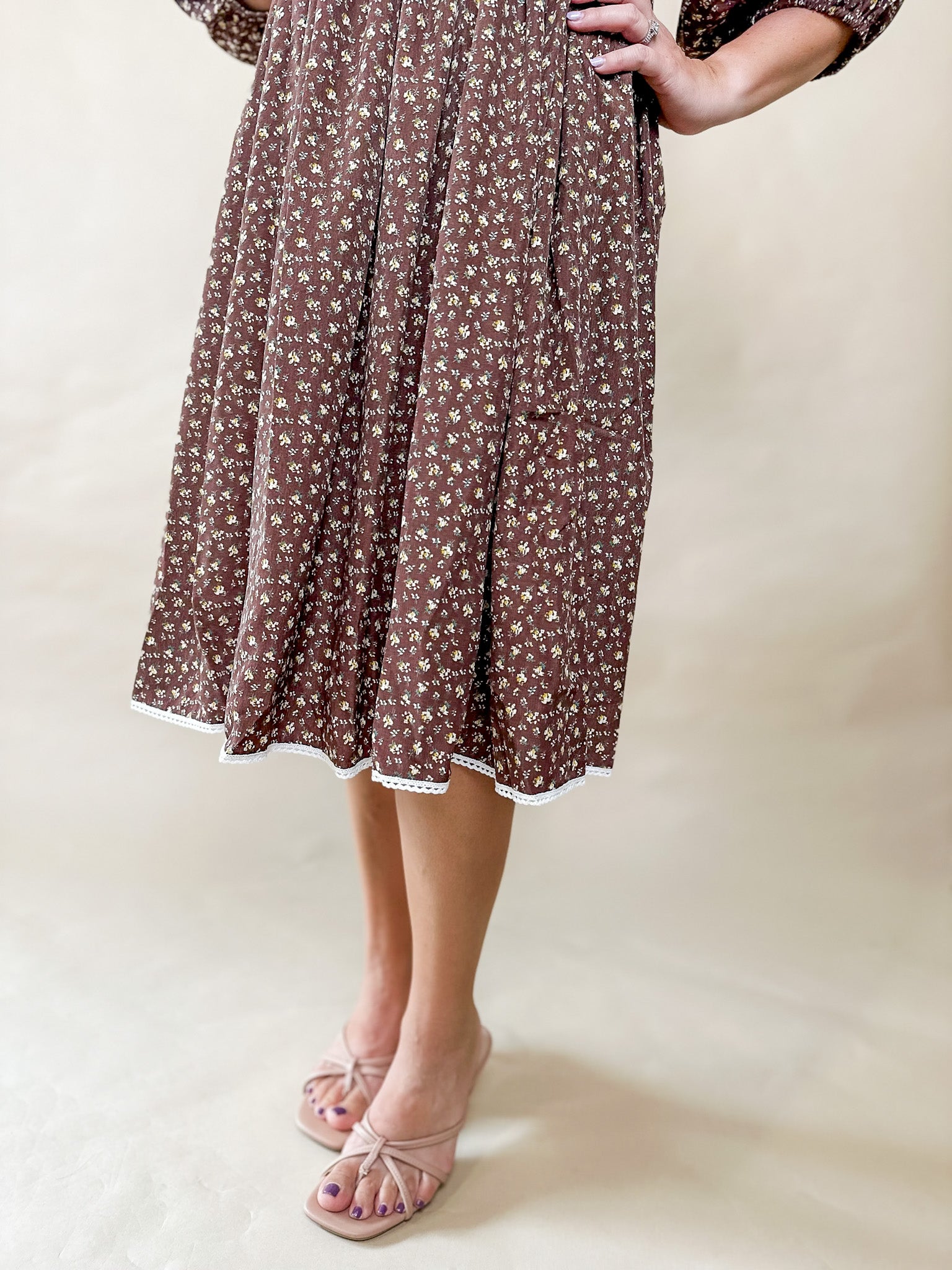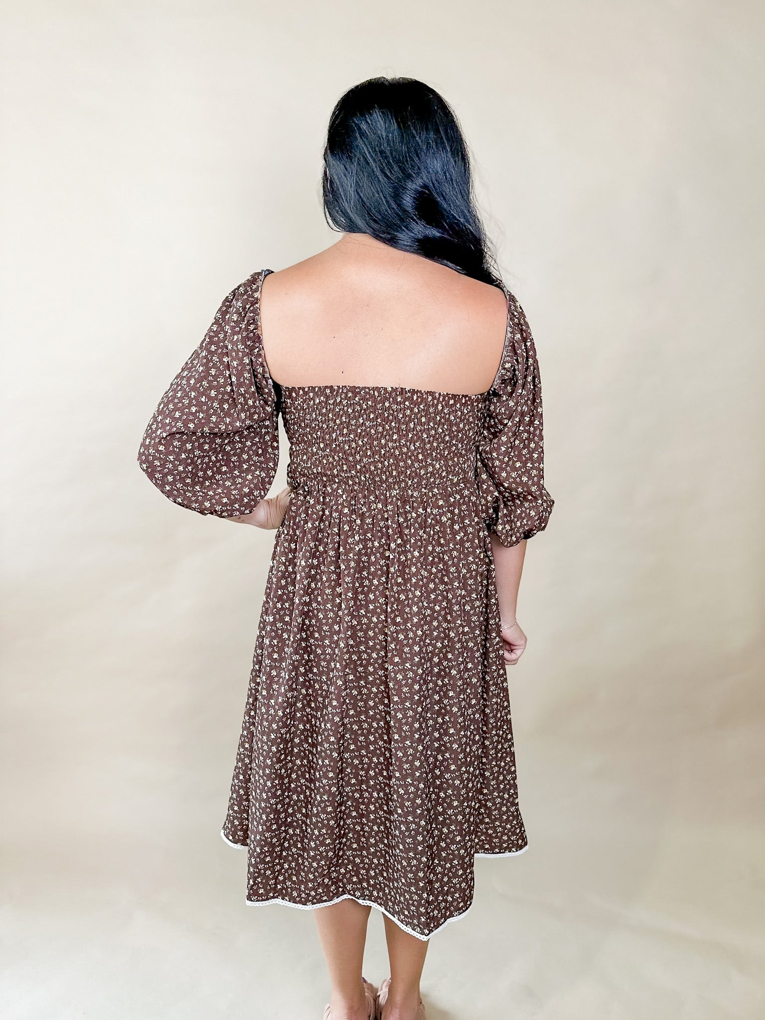 Say hello to your new favorite fall dress. This brown floral midi is designed with a smocked bodice and square neckline that flatters every shape. The puff sleeves add a romantic touch, while the flowy skirt makes it an easy pick for both everyday wear and special occasions. Finished with a delicate lace hem, this dress is the perfect mix of feminine and timeless.