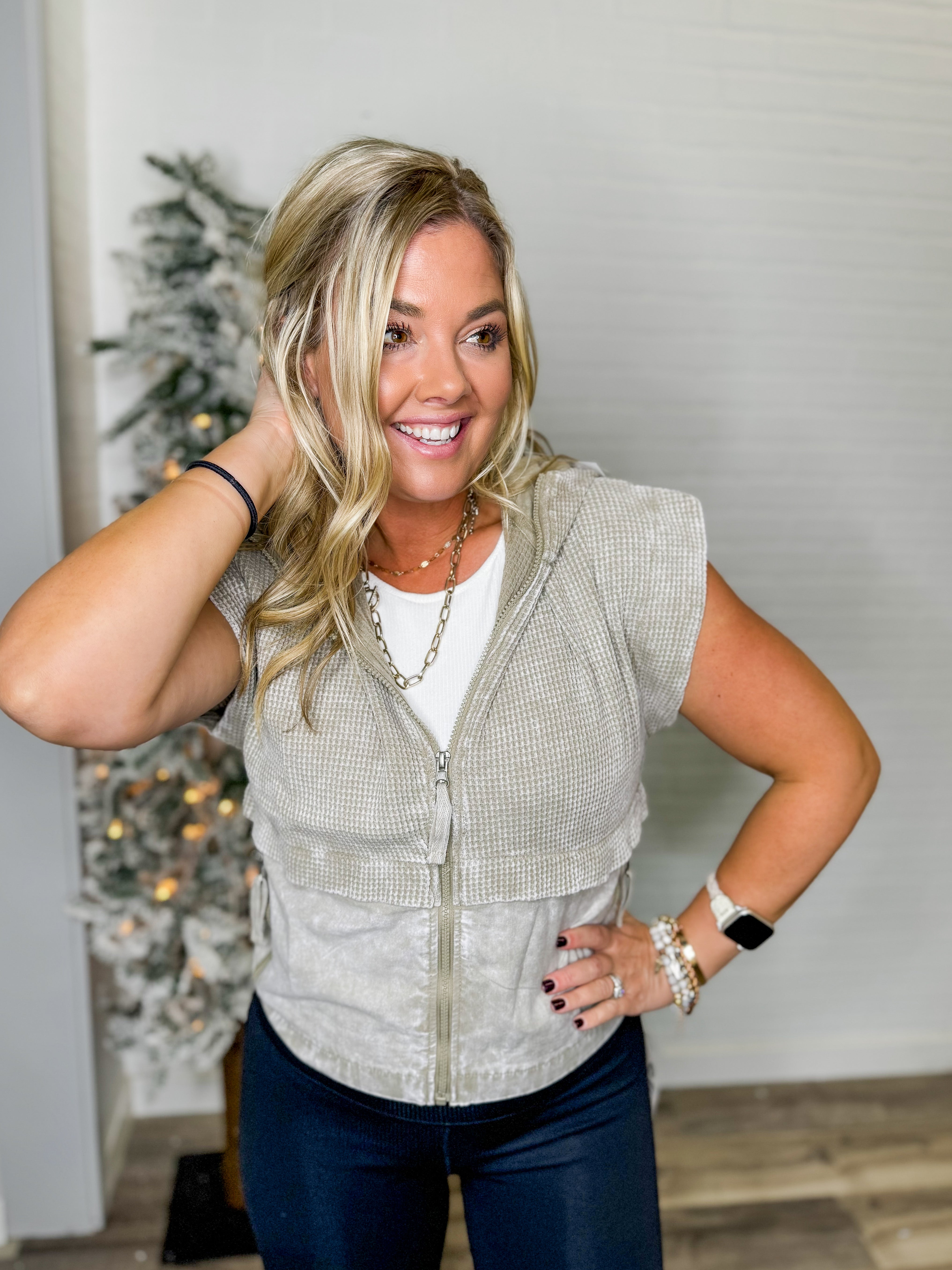 Step up your casual look with this darling short-sleeve zip-up hoodie. Made with 100% cotton, this hoodie features an overall mineral wash with a waffle knit fabric on top and a contrast woven lower body. The look is completed with a full front zip, zippered hand pockets, and a fully lined hood. Wear solo or over a long sleeve for a layered look!