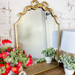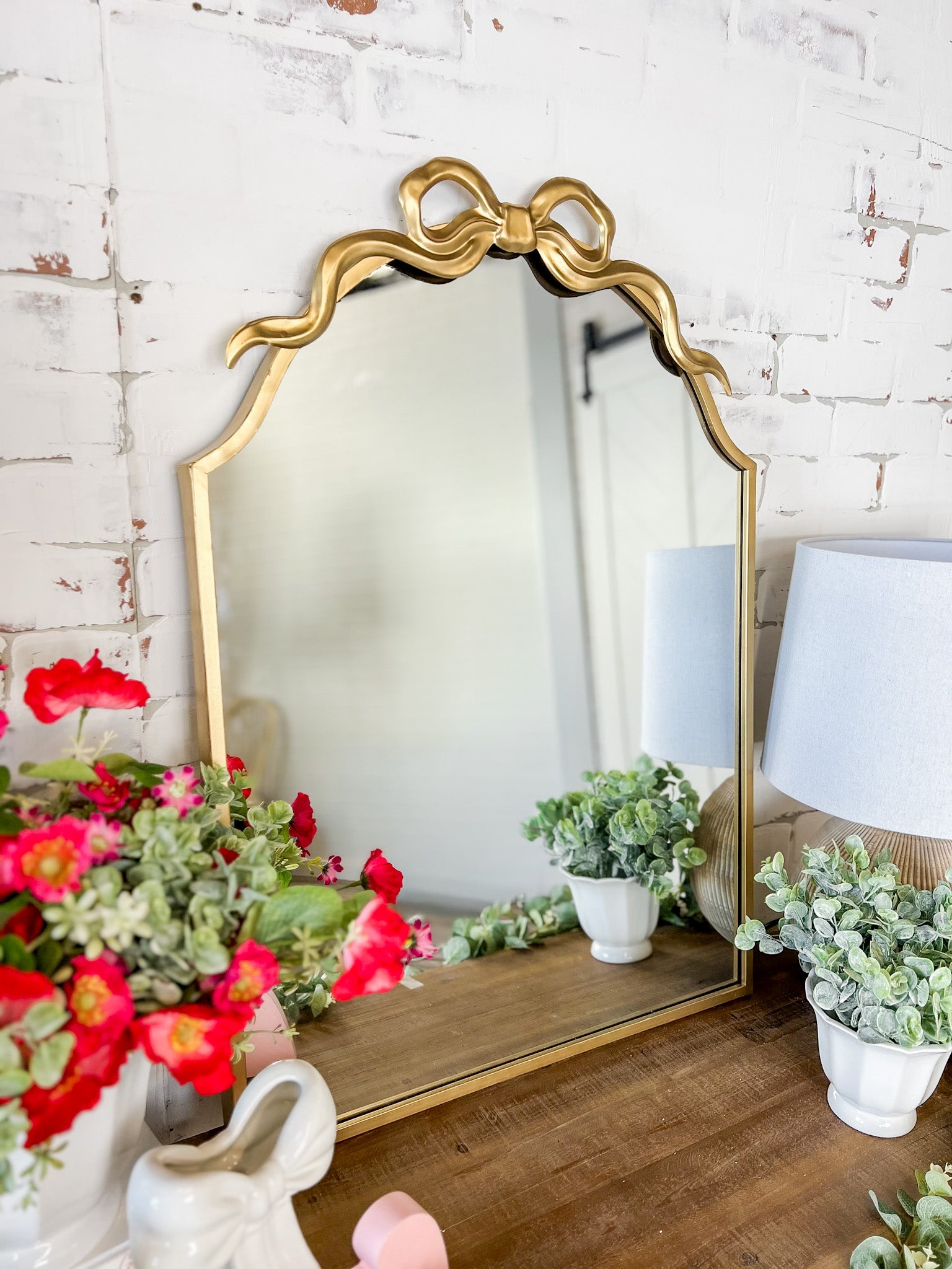This gold bow mirror brings charm, elegance and just the right amount of personality to your space. The sculpted bow detail adds a feminine touch while the gold frame keeps it classic and timeless. It’s the perfect statement piece for dressers, vanities or styled shelves.