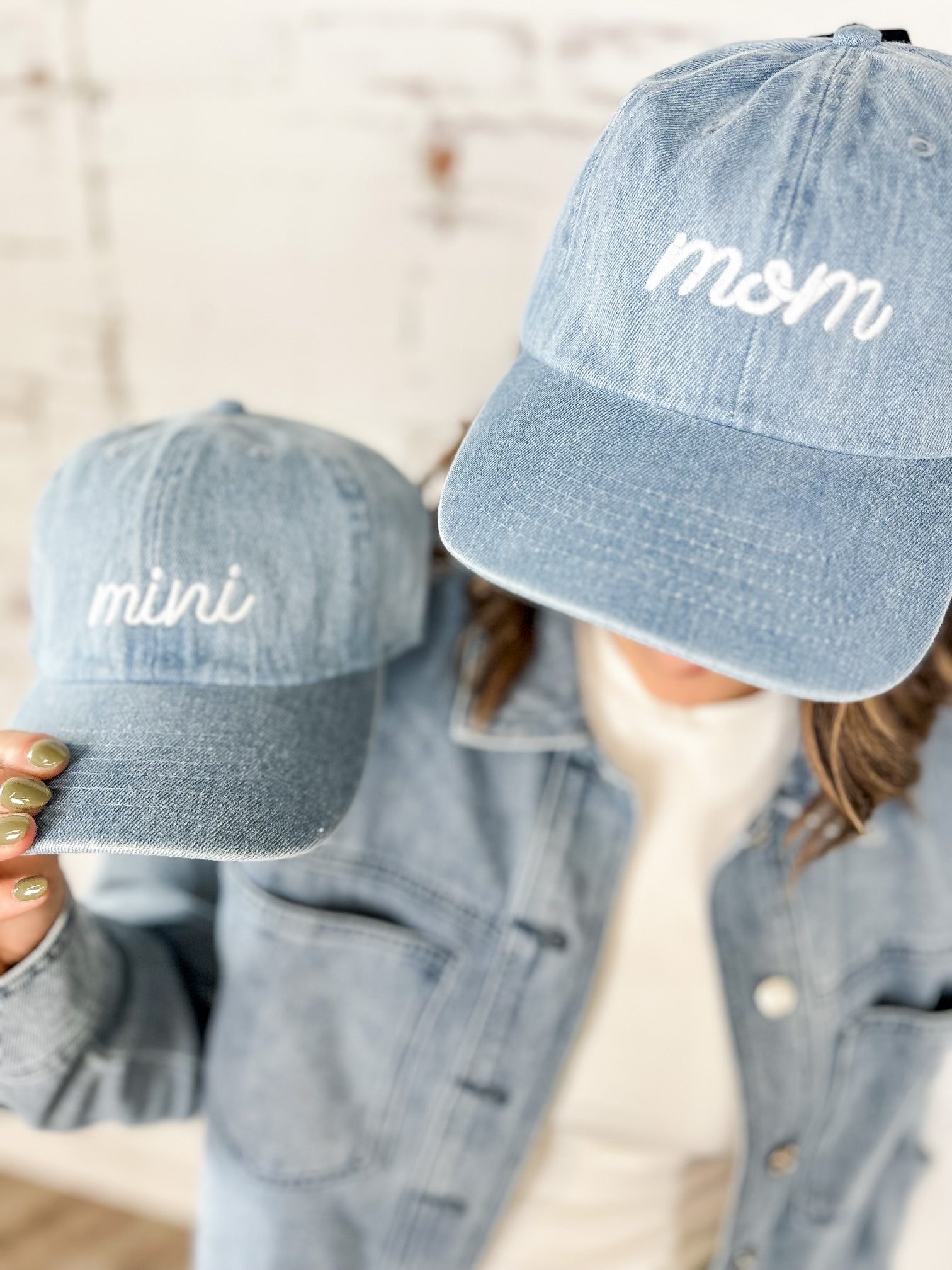 Match your mini's style with our Mom Cap - perfect for both moms and mini-me's! The denim cap is a stylish and fun accessory!