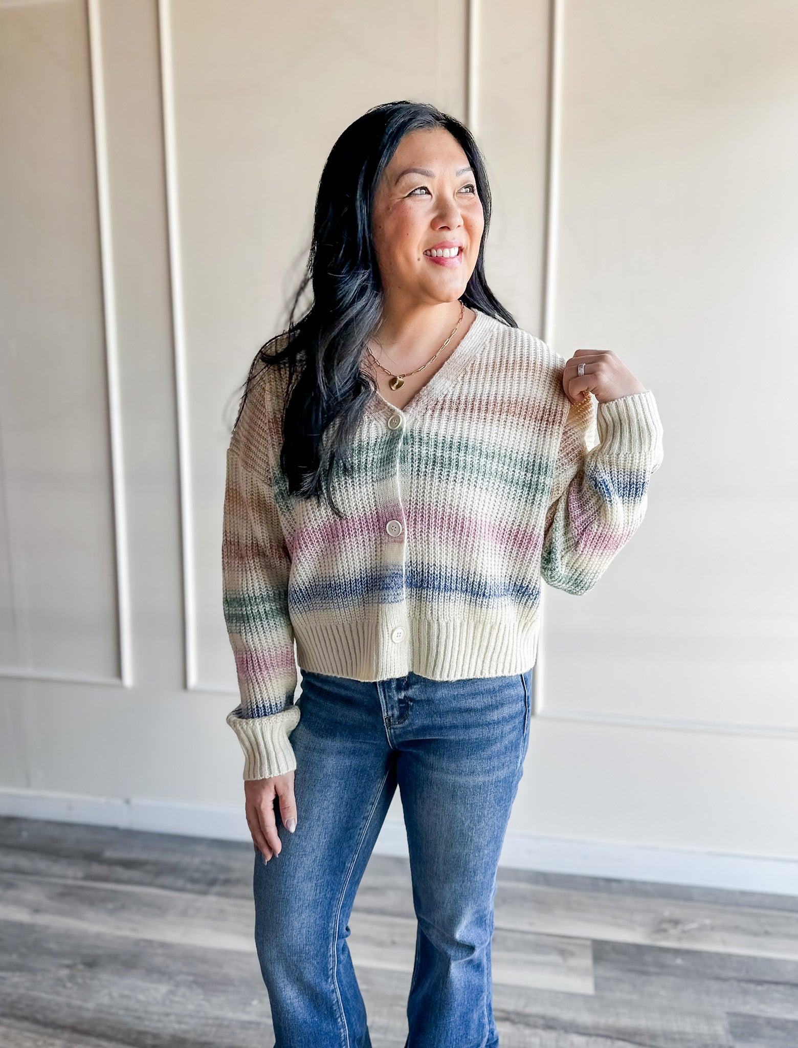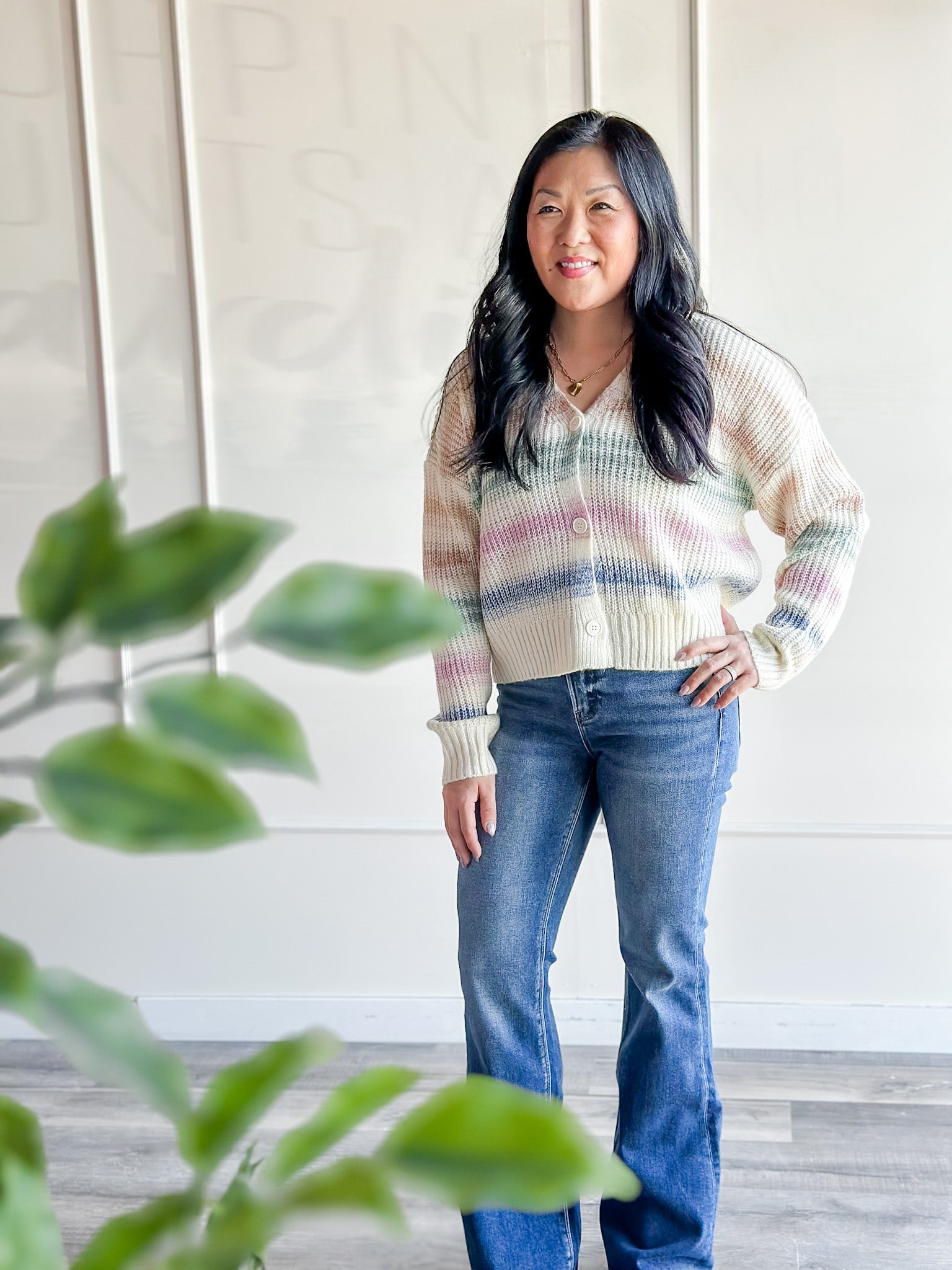 This pastel stripe cardigan brings together subtle color and classic knit texture for an easy everyday layer. Designed with a relaxed fit and button front, it’s perfect worn on its own or layered over tanks and tees for a polished but comfortable look.
