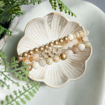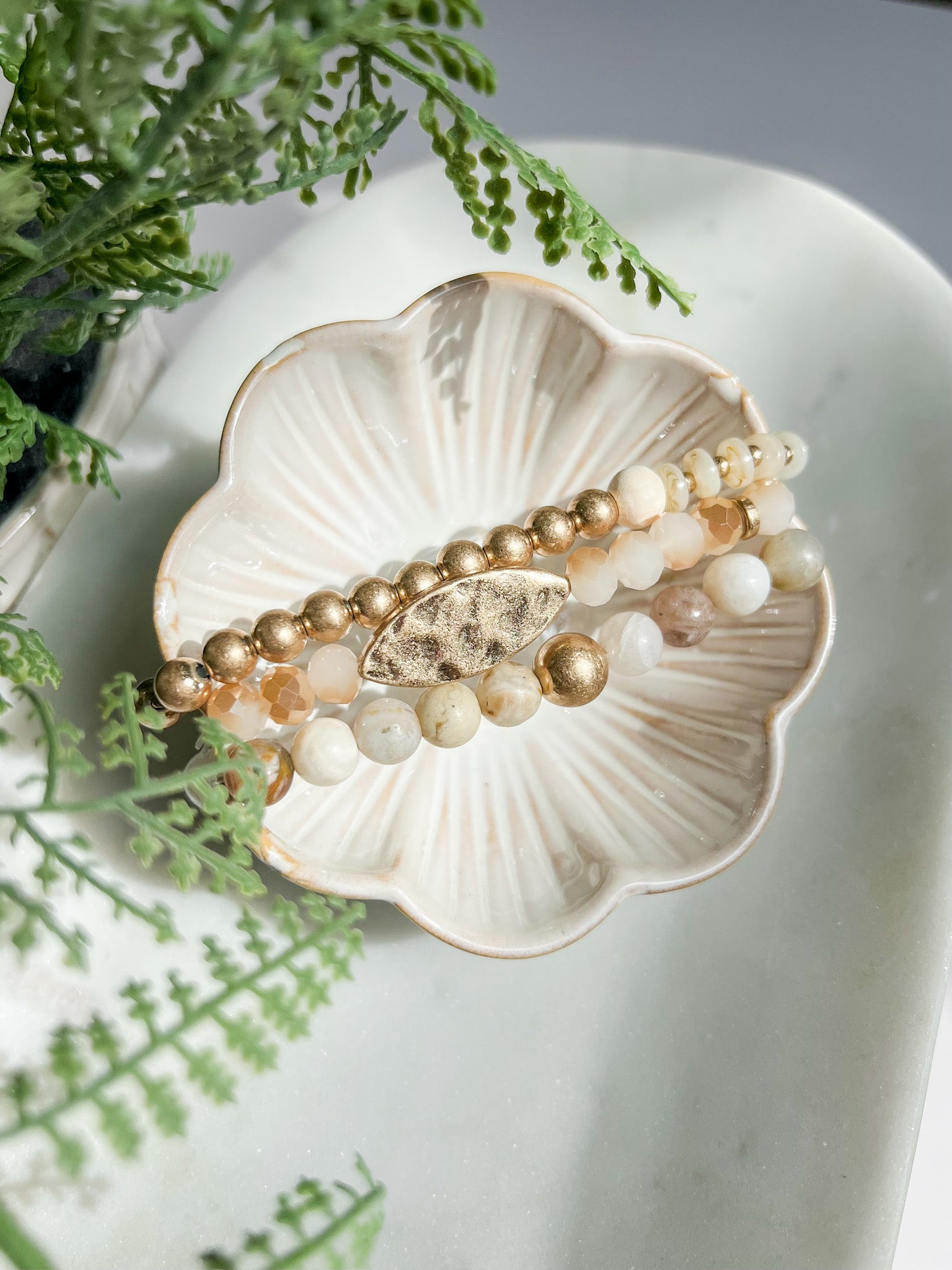 Soft neutral beads with brushed gold accents and a hammered centerpiece make this trio your new go-to. Light-catching, versatile, and perfect for layering.