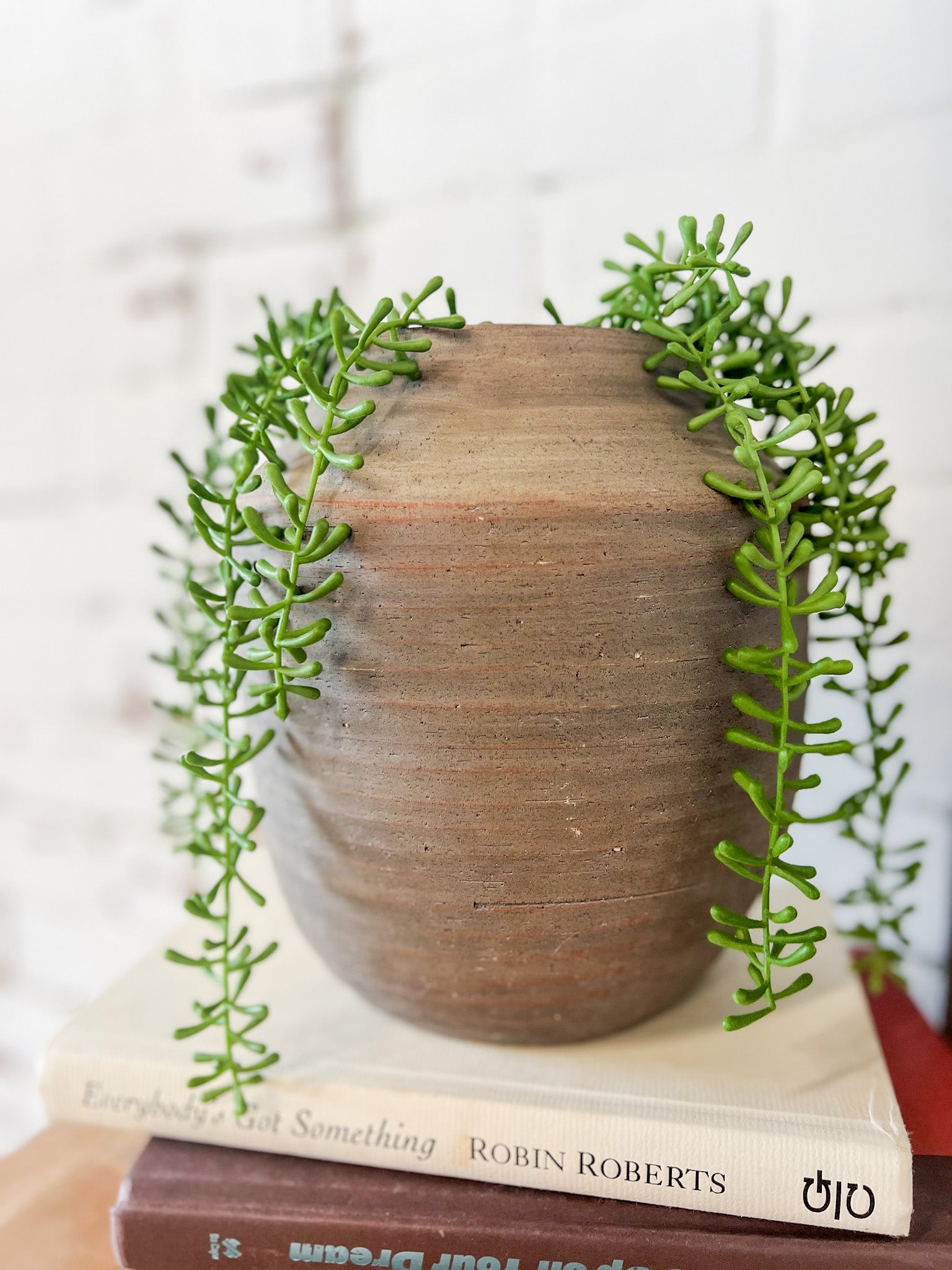 This natural-toned vase features a matte clay finish and rounded silhouette that anchors any arrangement—greenery or not. Looks gorgeous on bookshelves, tabletops, or styled in a tray.