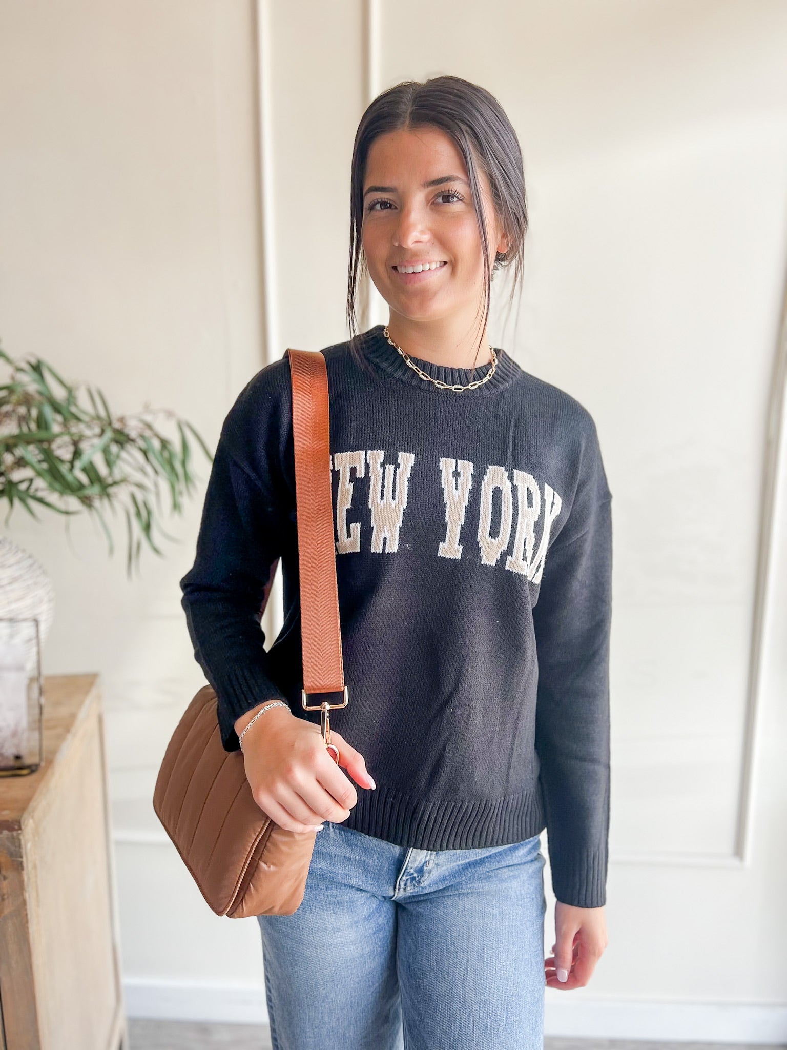 Cozy meets cool in the Big City Energy Sweater. With bold “NEW YORK” lettering across the front, this soft black knit gives off effortless street style while keeping you snug. Perfect for layering with denim, tossing on with joggers, or dressing up with a chic jacket—this sweater is as versatile as it is comfy.