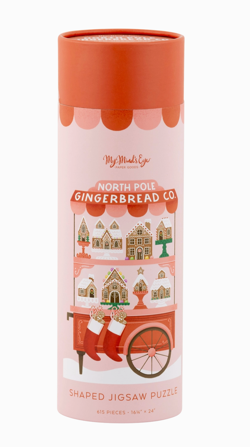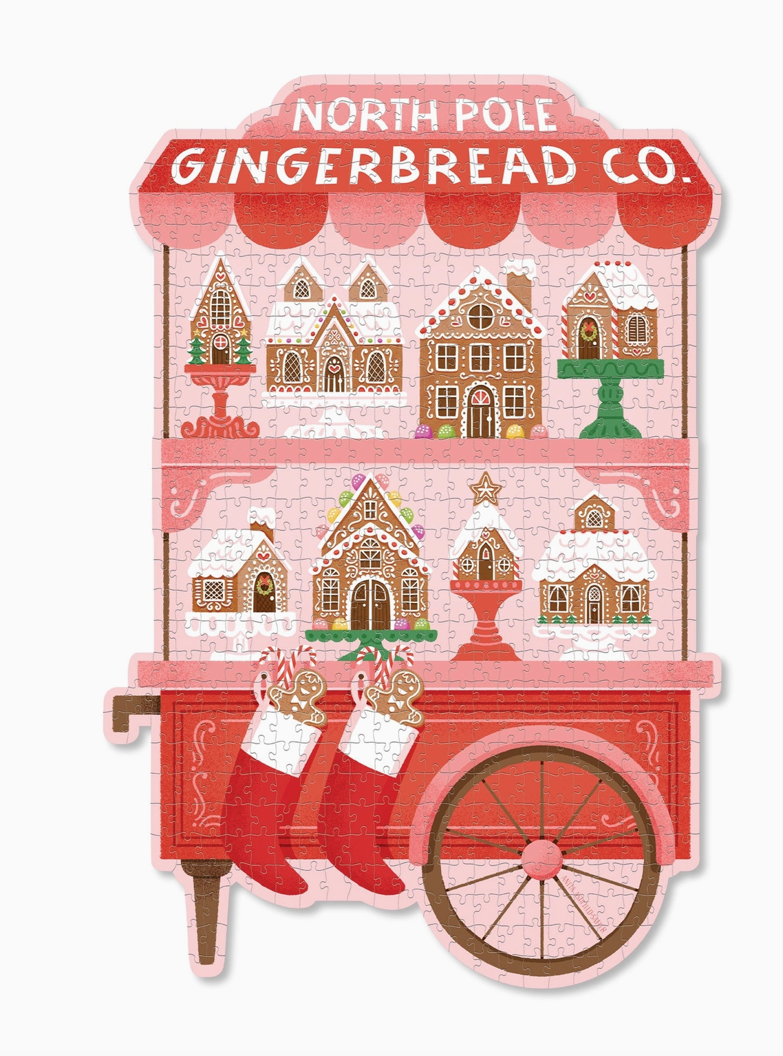 Indulge in a festive puzzle with our North Pole Gingerbread Co Shaped Christmas Puzzle. This vintage candy cart is piled high with all the gingerbread goodies and treats, create a cozy winter afternoon while putting it together with your special someone. Featured artwork from Anita Ashfield-Salter. * chipboard jigsaw puzzle * 615 pieces * finished puzzle size is 16.25" x 24"