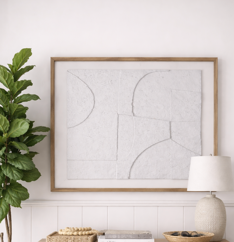 Make a statement with this oversized 39x47" framed wall art. Featuring a subtle textured design with soft geometric detailing, this piece adds depth and interest while keeping your space calm and neutral.