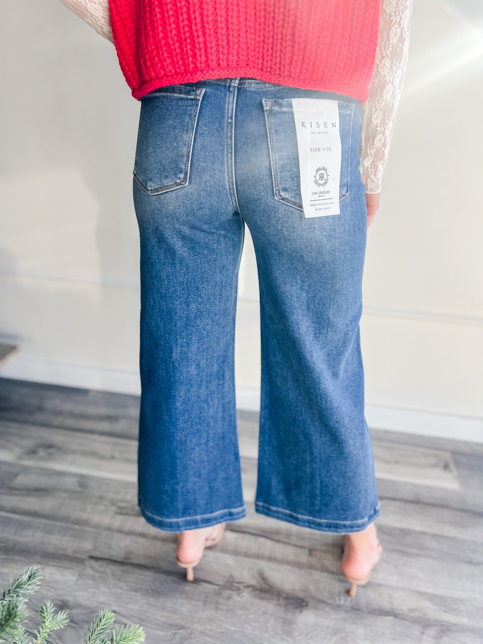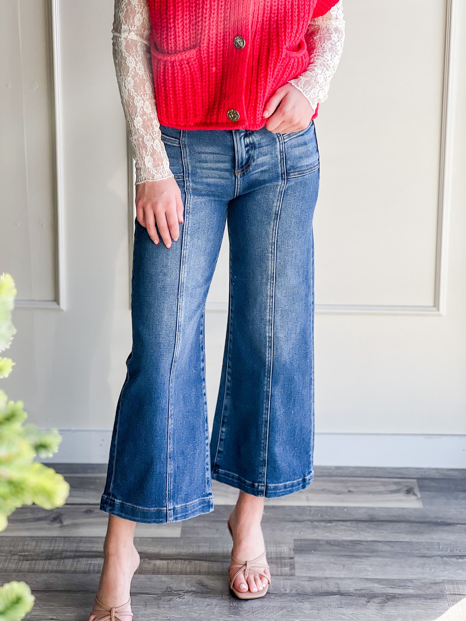 Meet your new go-to jeans for doing all the things. School drop-off, grocery run, coffee date, then straight to dinner? Done and done. These wide-leg jeans were made for real life—structured enough to hold their shape, soft enough to move with you, and flattering from every angle thanks to the high rise and contrast seams that visually lengthen your legs.