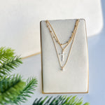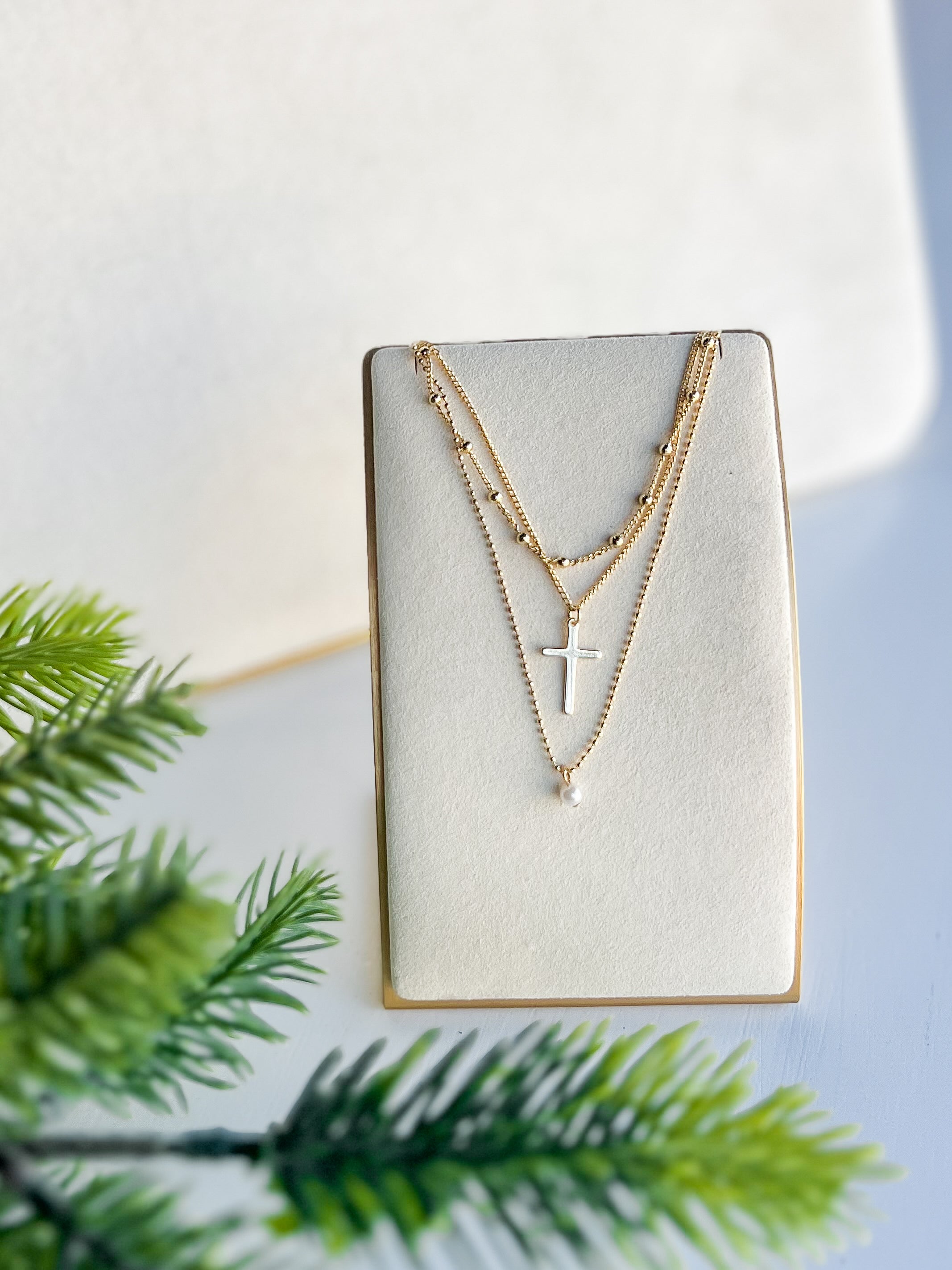 Three dainty gold chains, one sweet pearl drop and a simple cross charm—this layered necklace brings effortless elegance with a meaningful touch. Lightweight, timeless and easy to wear with any neckline.