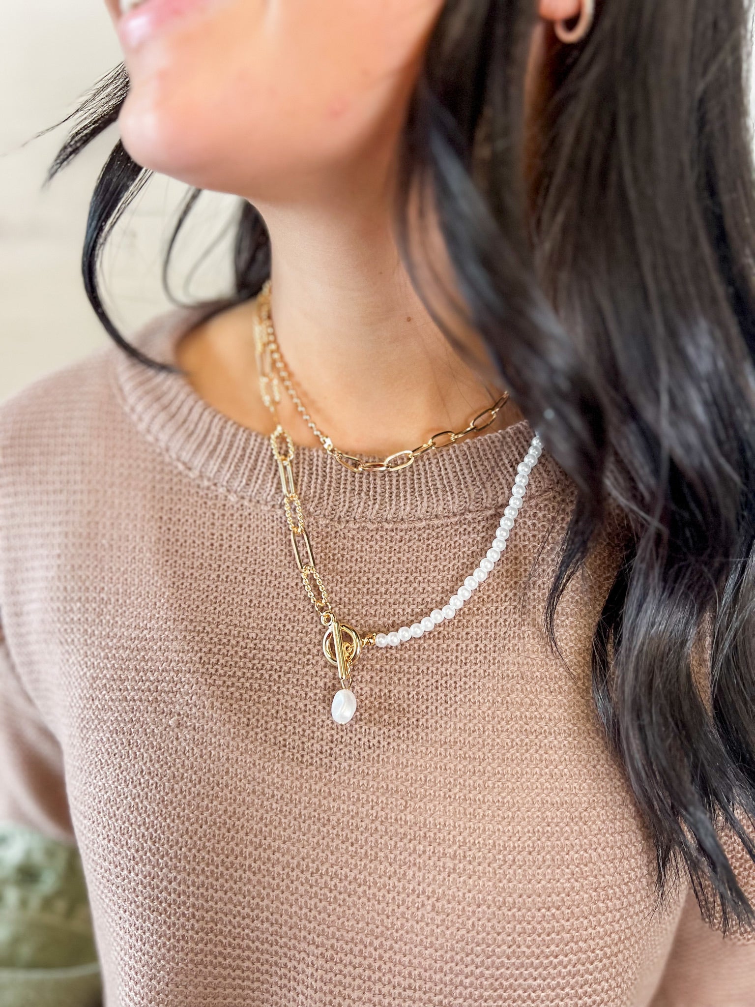A statement piece with a soft, feminine twist. This mixed-chain necklace blends pearls, gold links and a chic toggle clasp with a drop pearl charm. Dress it up, dress it down — it makes every outfit feel special.