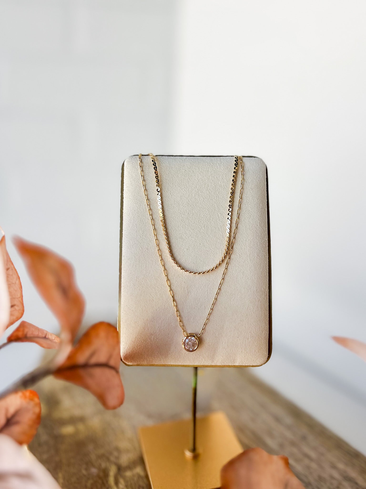 Subtle layers with a touch of glam. This two-in-one necklace pairs a simple chain with a solitaire crystal pendant for just the right amount of shimmer. It’s the kind of everyday sparkle that dresses up your favorite tee or elevates date night looks.