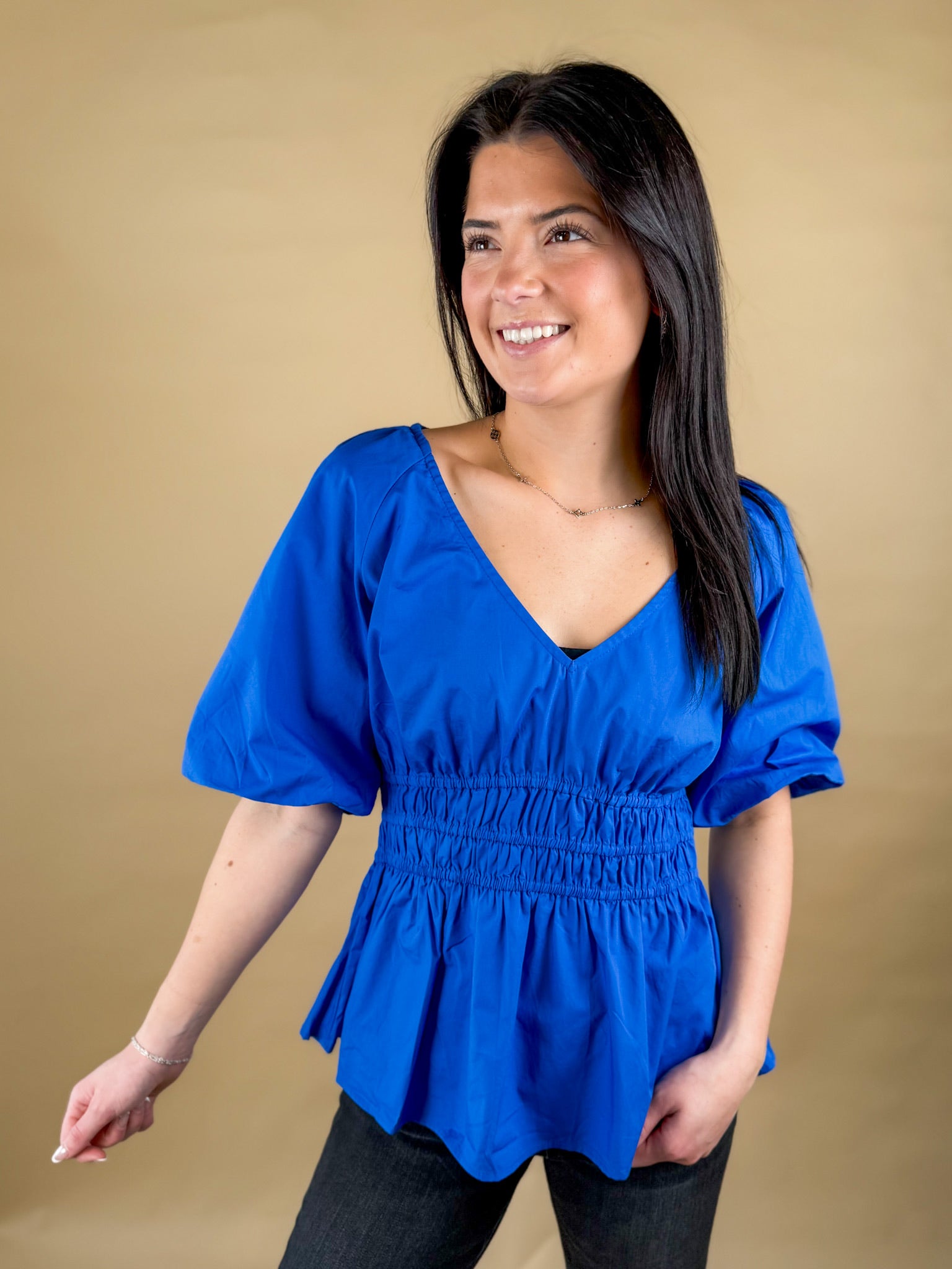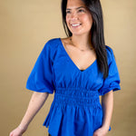 A bold blue blouse that’s equal parts flattering and fun. The smocked waist creates a beautiful shape while the flowy peplum and puff sleeves keep things light, feminine and easy to wear from day to night.