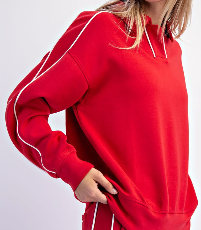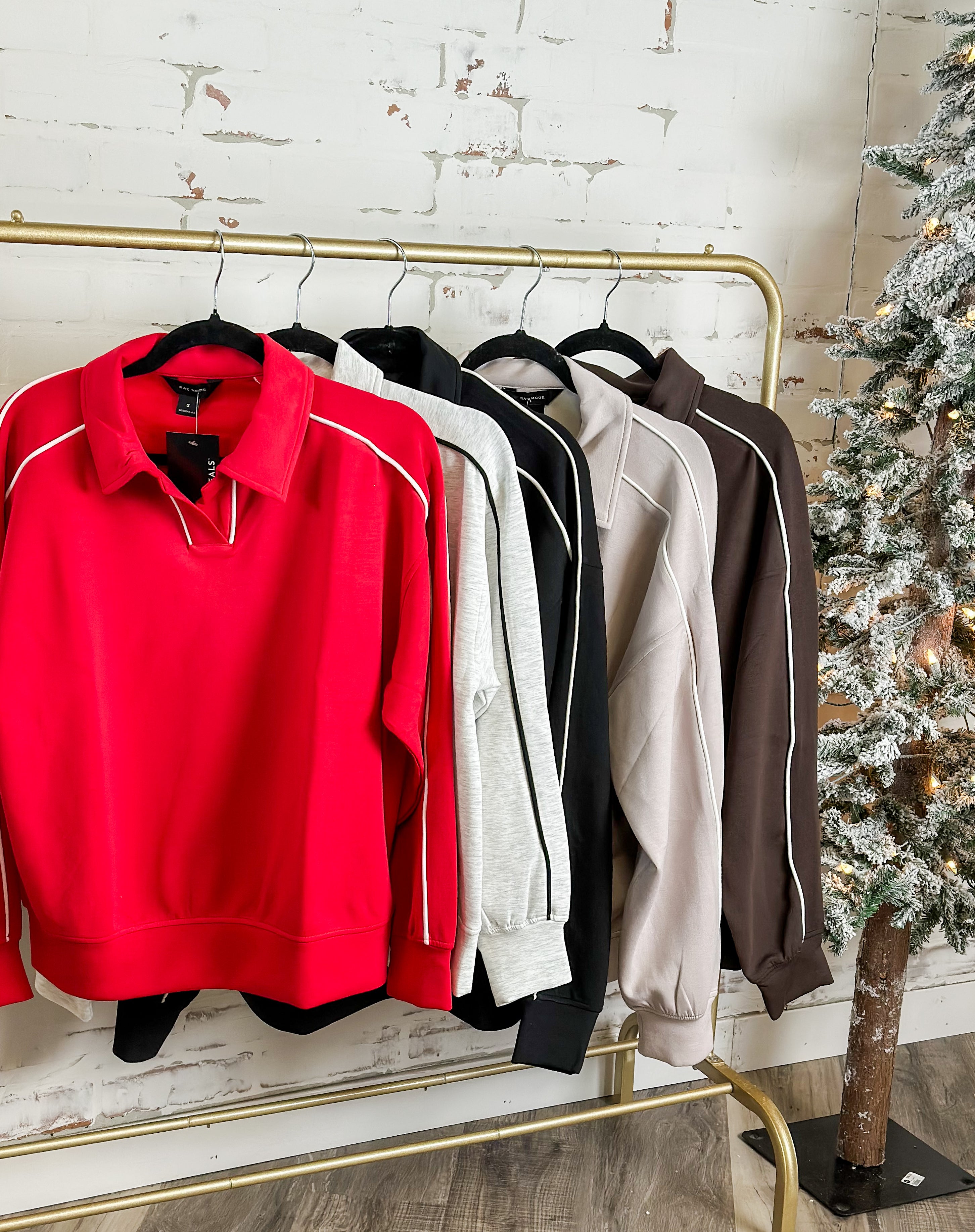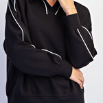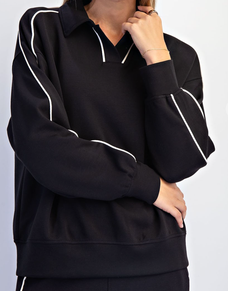 Meet the everyday elevated essential your winter wardrobe is craving. Our Modal Scuba Double Piping Polo Top blends luxe comfort with sporty-chic detailing, giving you that effortlessly polished look without sacrificing a second of coziness. The soft scuba fabric drapes beautifully, the contrast piping adds that tailored edge, and the relaxed polo neckline keeps things casual but refined. Perfect for school drop-off, office days, holiday errands, or cozy nights in.