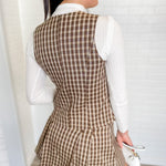 Classic plaid with a playful twist. This brown check skirt is a closet staple with timeless fall vibes. Designed with a flattering high waist and soft pleats, it’s perfect for pairing with boots, sweaters, or the matching vest top. Chloe is 5’7” and wearing a size small.