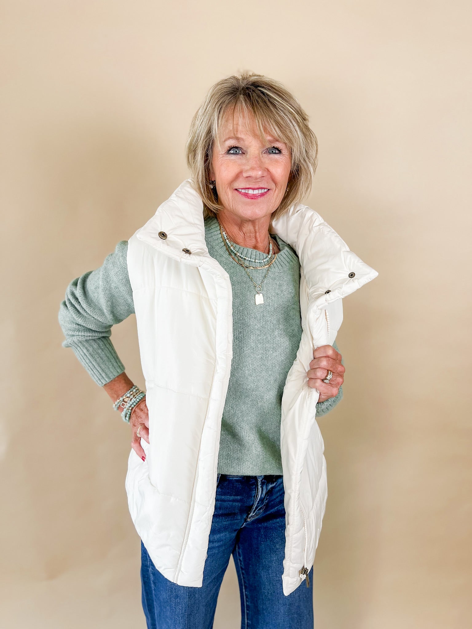 Bundle up in style with our Quilted Puffer Vest — the ultimate layering piece for chilly days and on-the-go errands. This soft, lightweight vest adds just the right amount of warmth without the bulk, and the longer length gives you that flattering, easy-to-wear silhouette we all love.