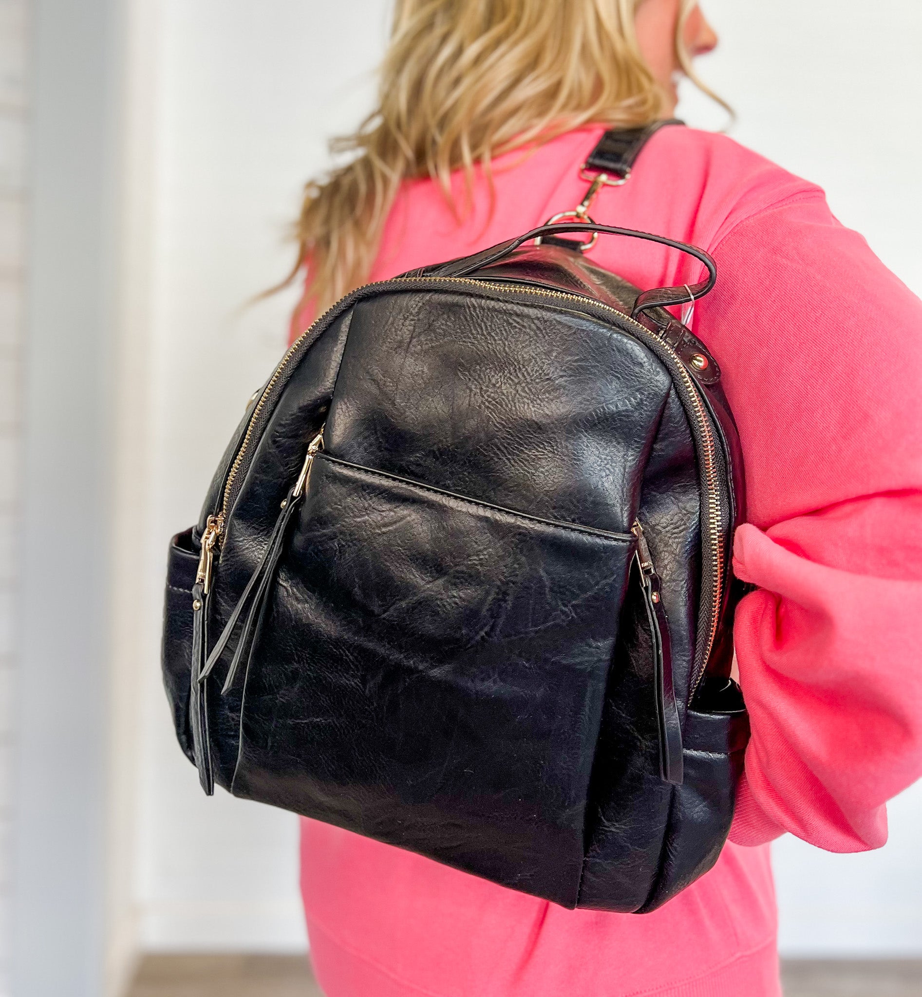 This black bag can be a backpack, sling bag, work bag, diaper bag or anything you’d like! We love the front zippers, side pockets and front pouch. Actually, we love it all and you will, too!