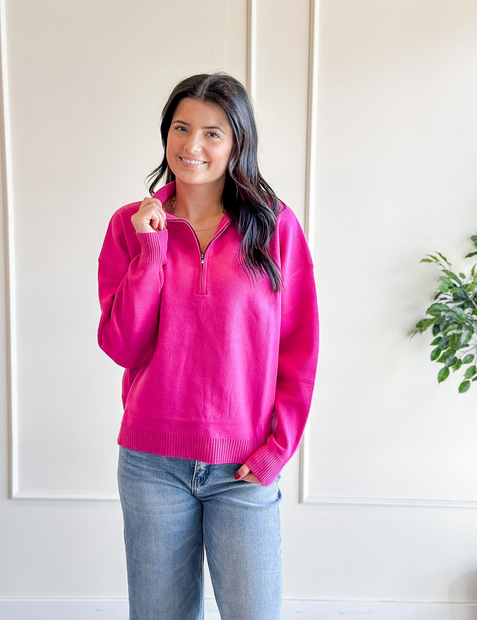 This hot pink knit pullover is the kind of piece that instantly brightens your outfit. Designed with a relaxed fit and quarter zip neckline, it’s easy to wear casually with denim or dressed up with layered accessories for a more polished look.