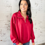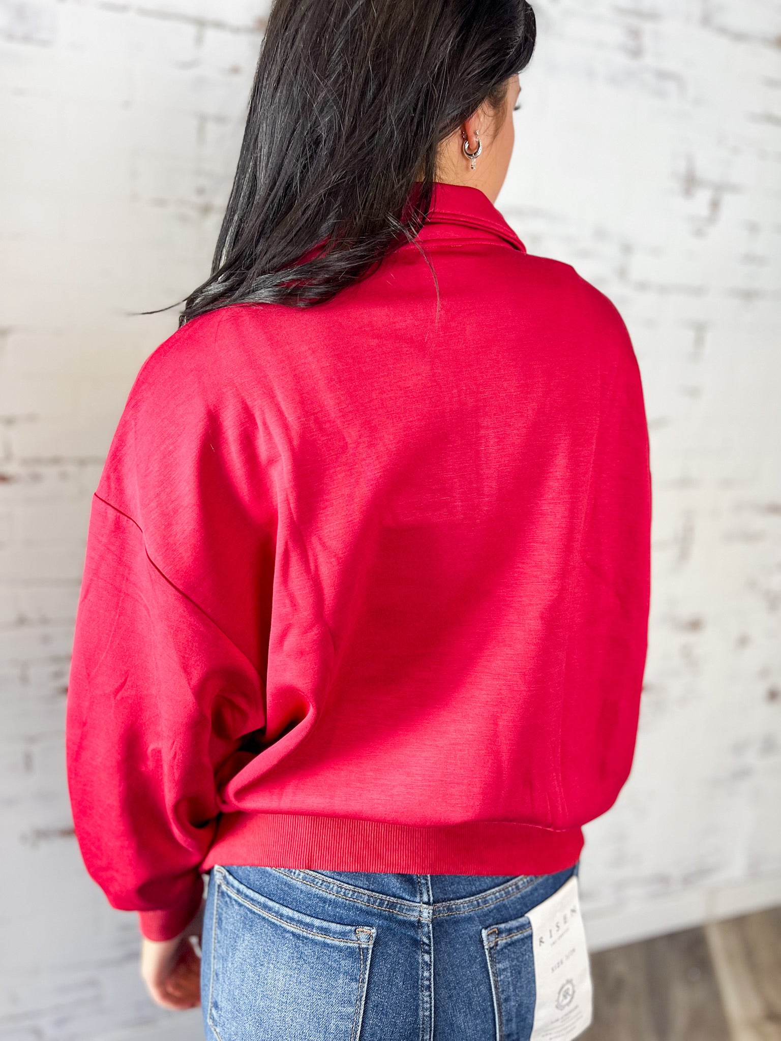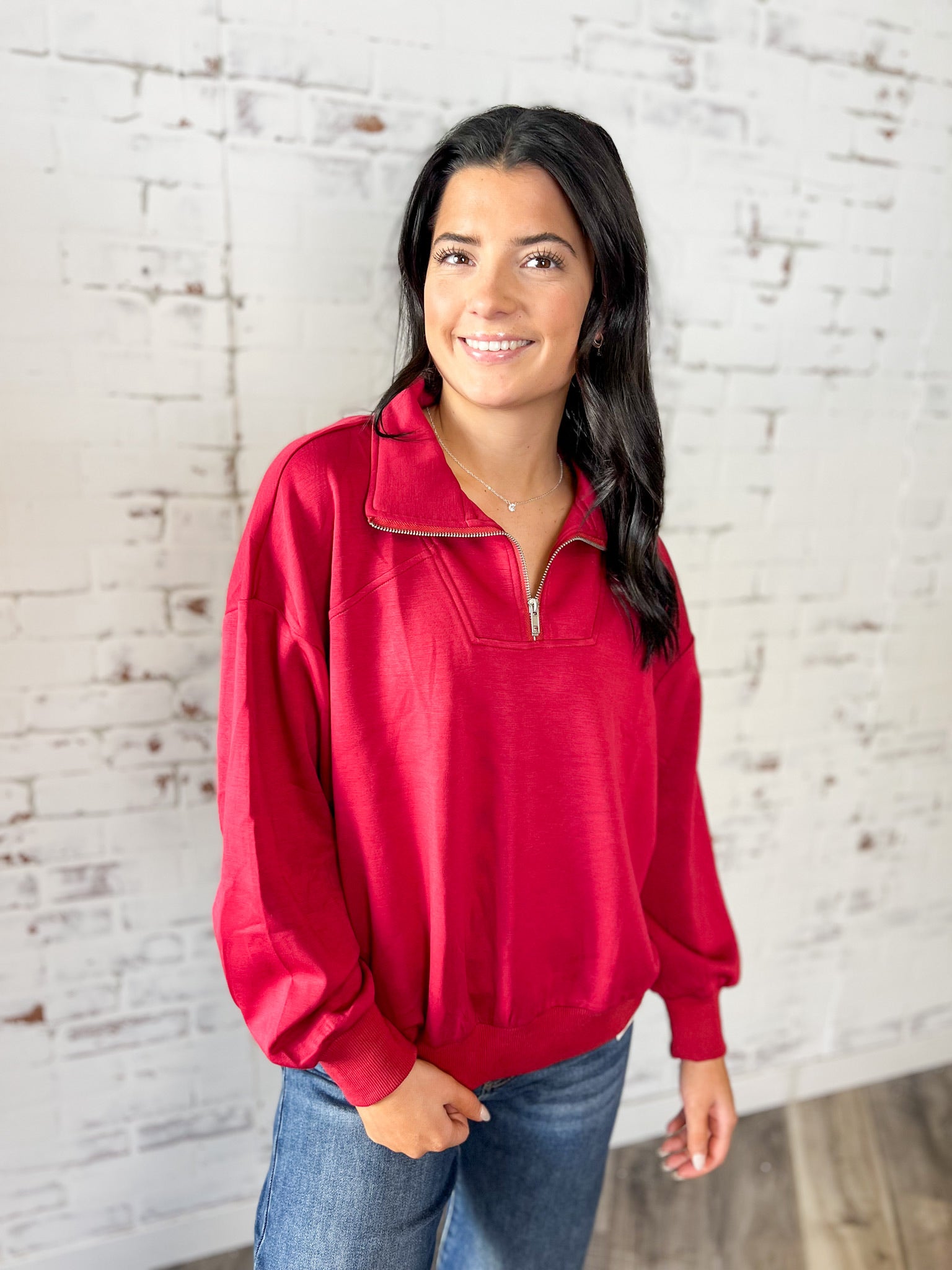 The Red Quarter Zip Pullover stands out for its vibrant color, flattering shape and just-right stretch that moves with you.