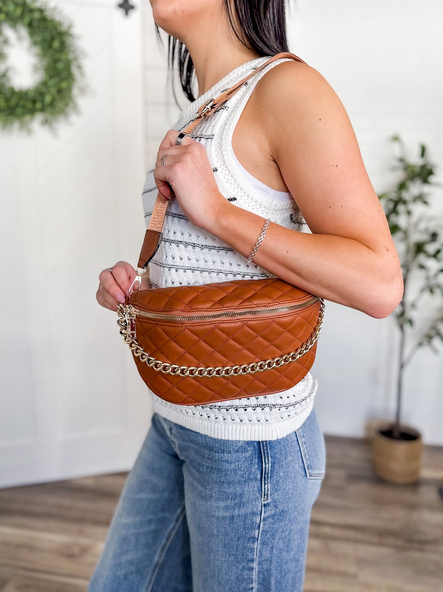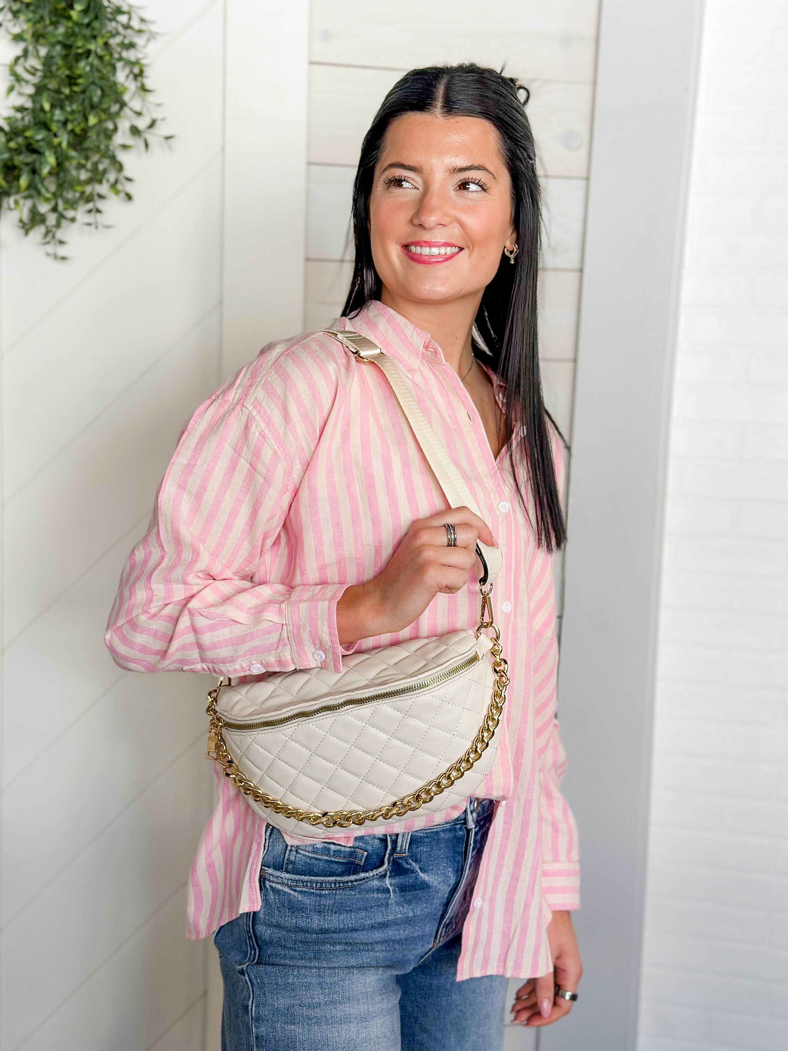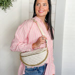 Hands-free and still completely put together. This quilted belt bag is the perfect mix of practical and polished with its soft quilted texture and statement gold chain detail. Available in bone and brown, it’s the kind of bag that instantly elevates a simple tee and jeans while keeping your essentials close.