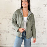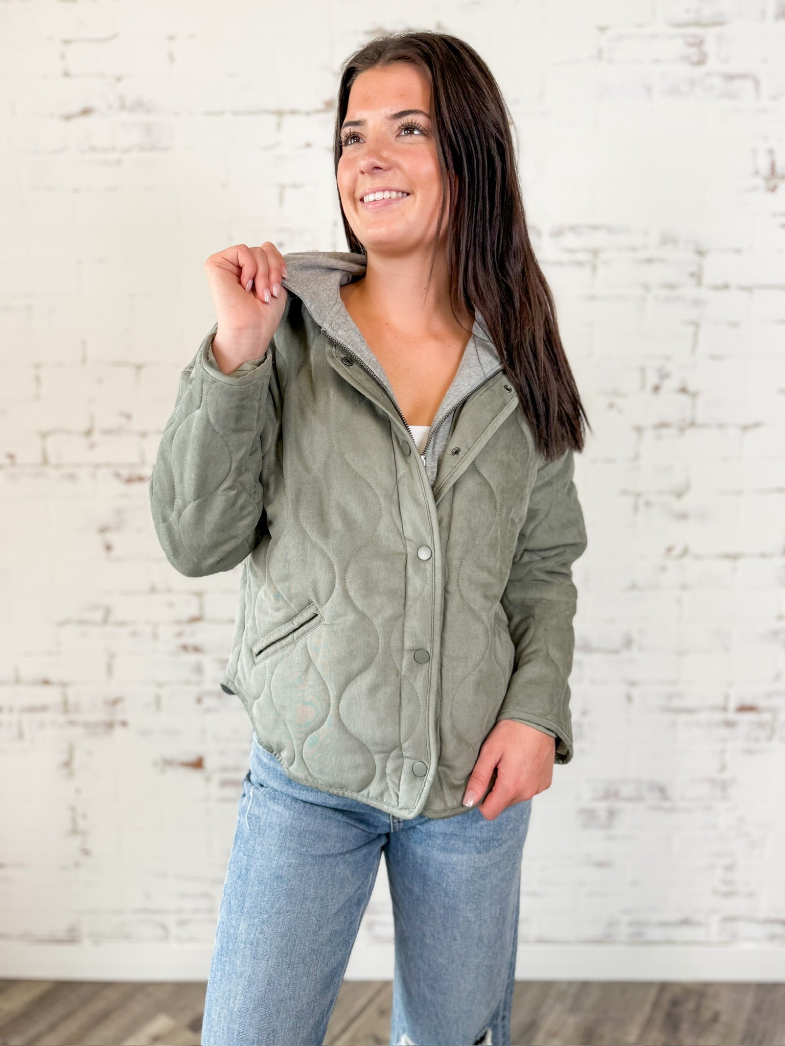 The ultimate throw-on-and-go jacket. This quilted button-up features a soft sage green finish, roomy pockets, and a detachable hood for versatile styling. Lightweight enough for layering but cozy enough to keep the chill out. Chloe is 5'7" wearing a size small, and the fit is true to size.